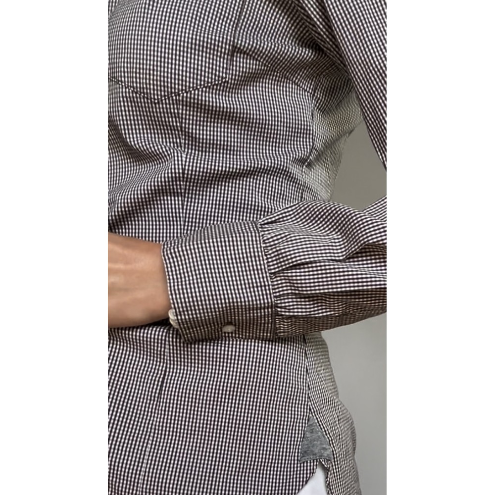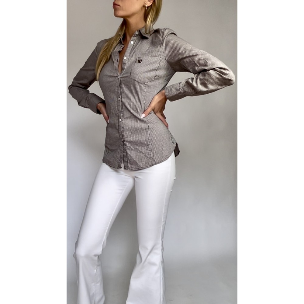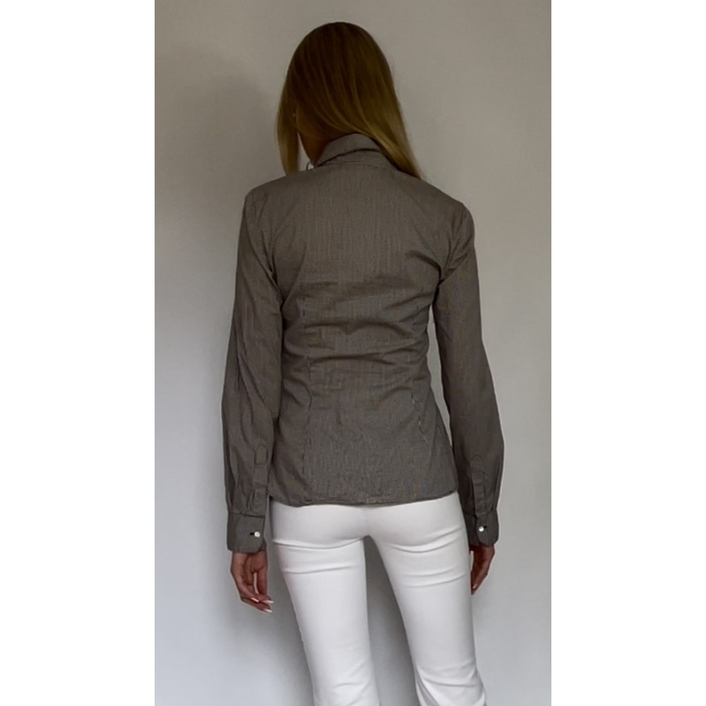 Brązowo biała koszula zapinana na guziki, z kieszonką, długie rękawy, kołnierz, mała delikatna krata.