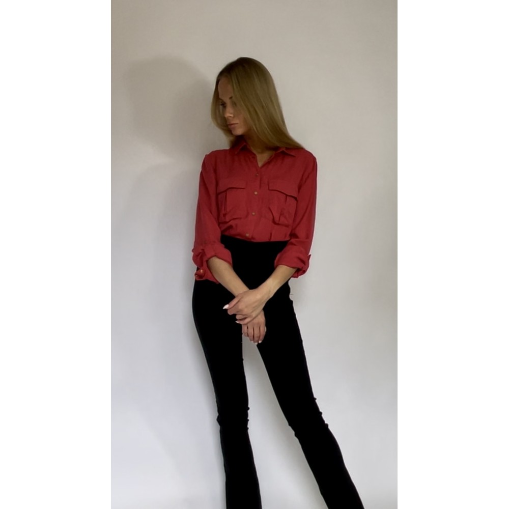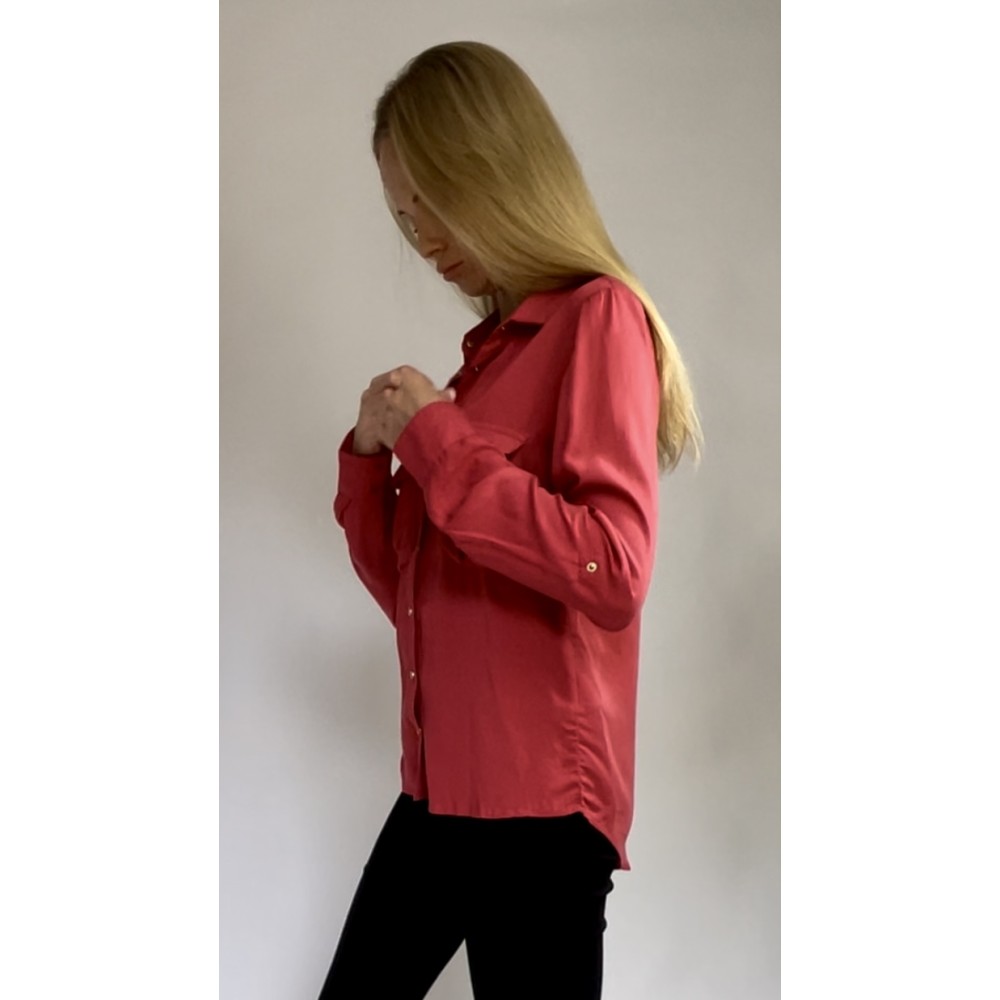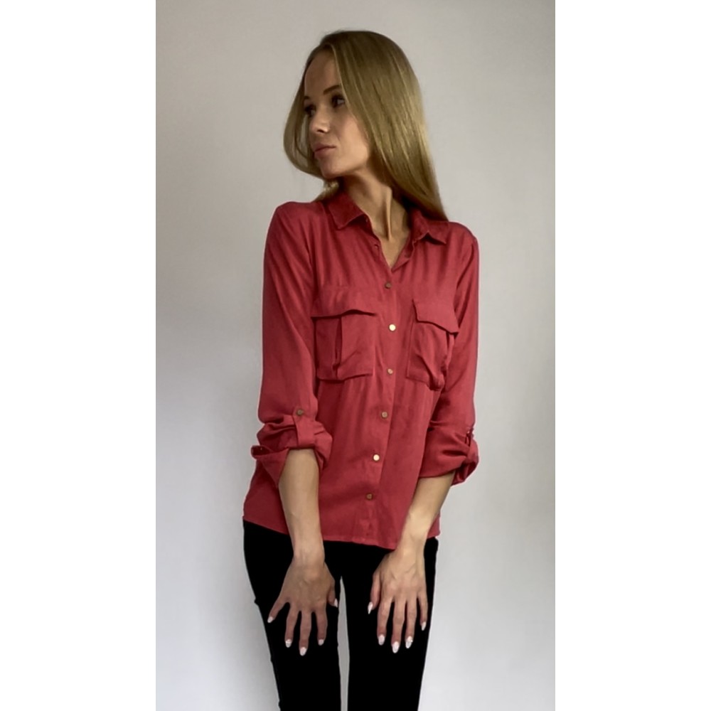 Koralowa koszula z wiskozy, długie rękawy, zapinana na napy/zatrzaski, z kieszonkami na przodzie, luźny krój.