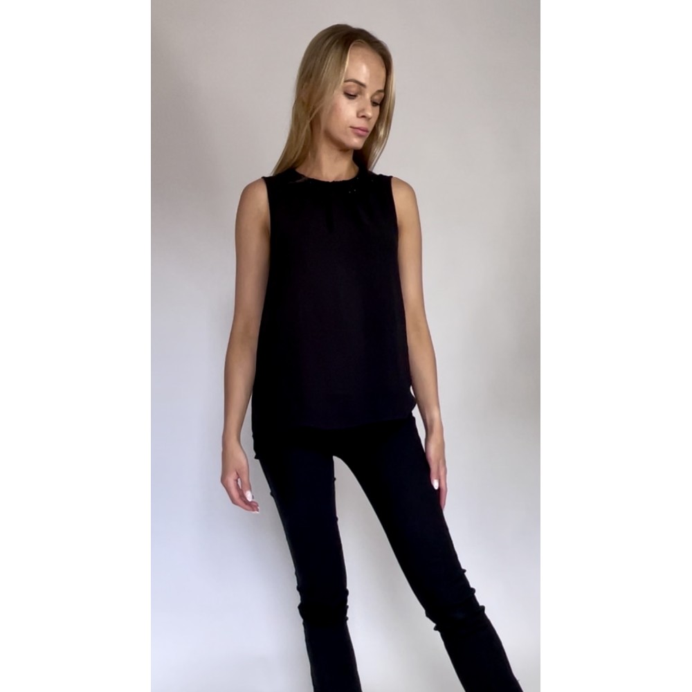 Bluzka bez rękawów, z podszewką, biżuteryjny okrągły kołnierz z koralikami, transparentny wierzchni materiał.