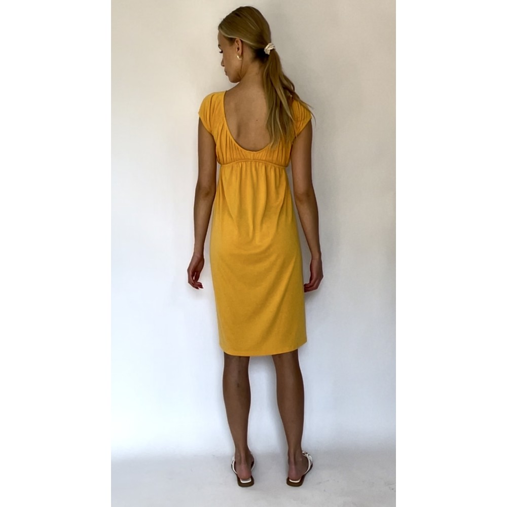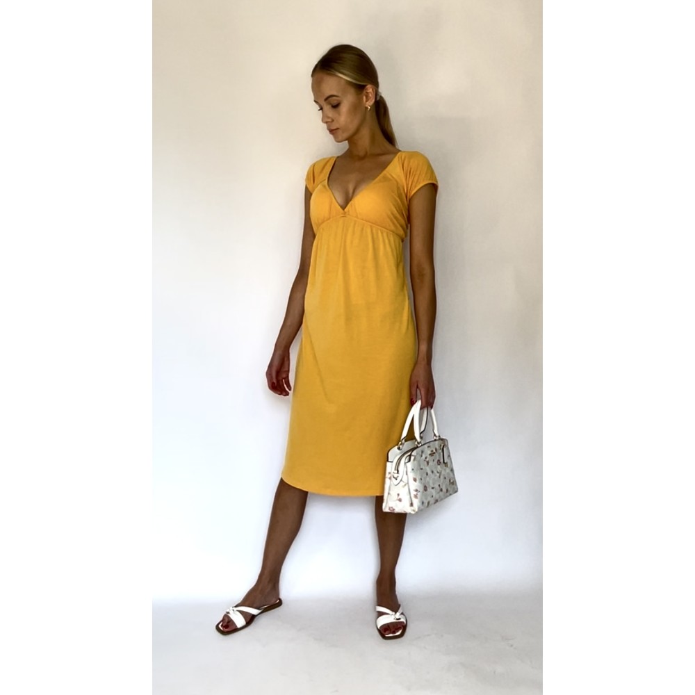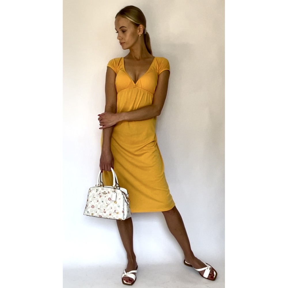 Żółta sukienka, średniej długości, krótkie rękawy, dekolt V.