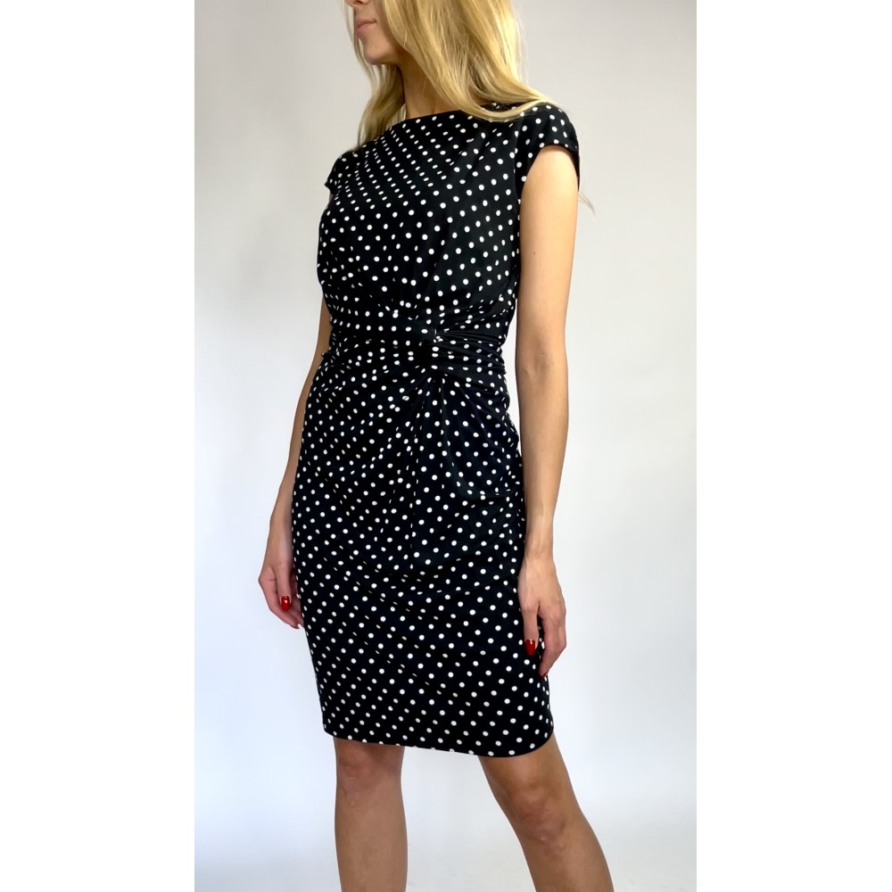 Czarna, krótka sukienka z wiskozy w białe groszki, krótkie rękawy, gumka w pasie, okrągły dekolt, ozdobne marszczenie.