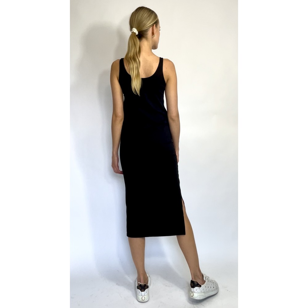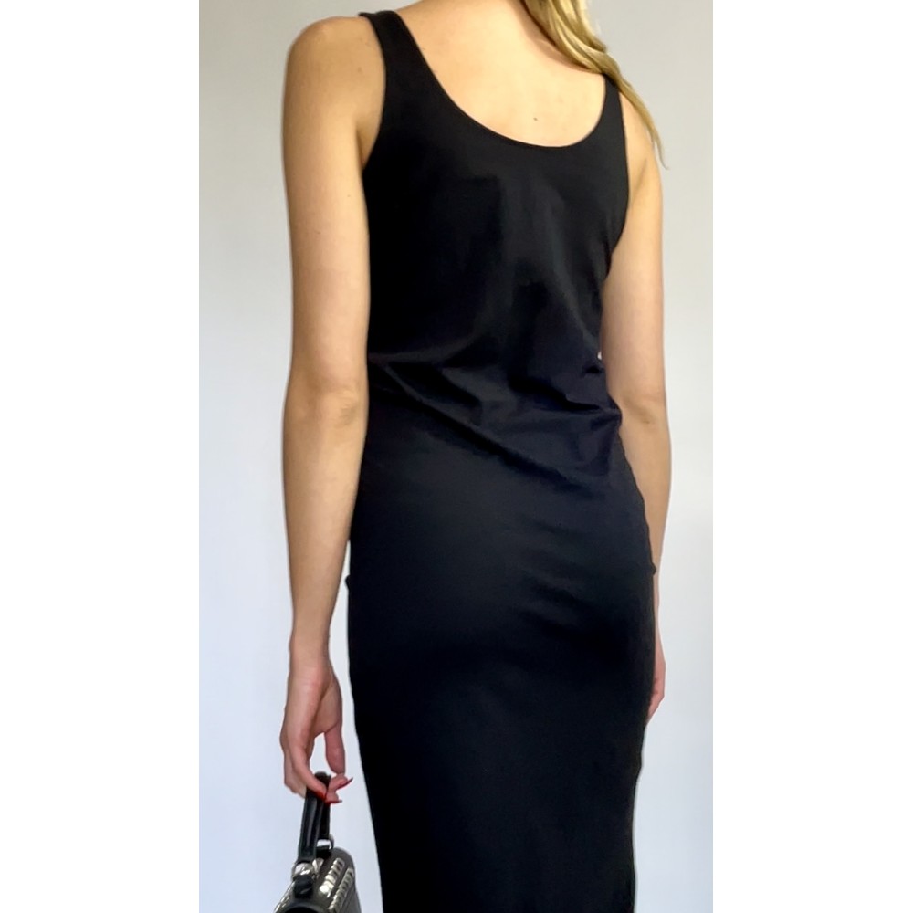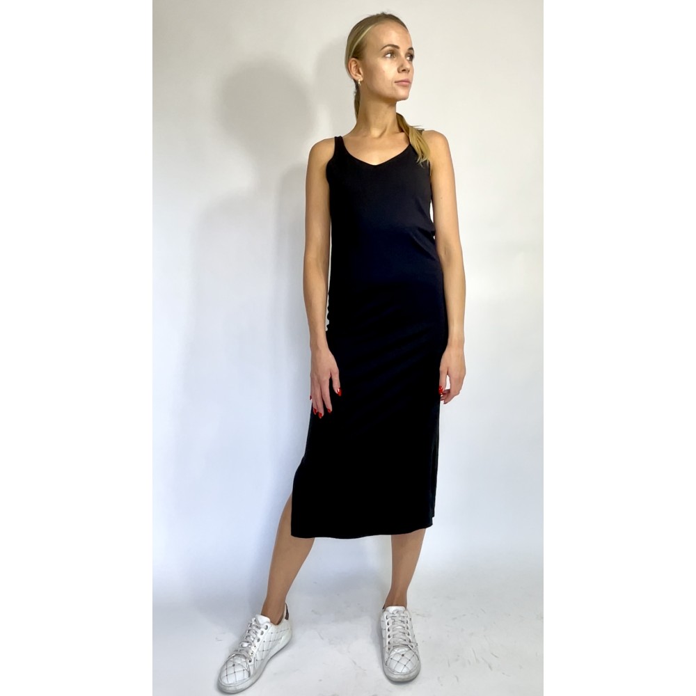 Czarna, prosta sukienka średniej długości, opinająca ciało, na ramiączkach, wycięcie przy nodze.