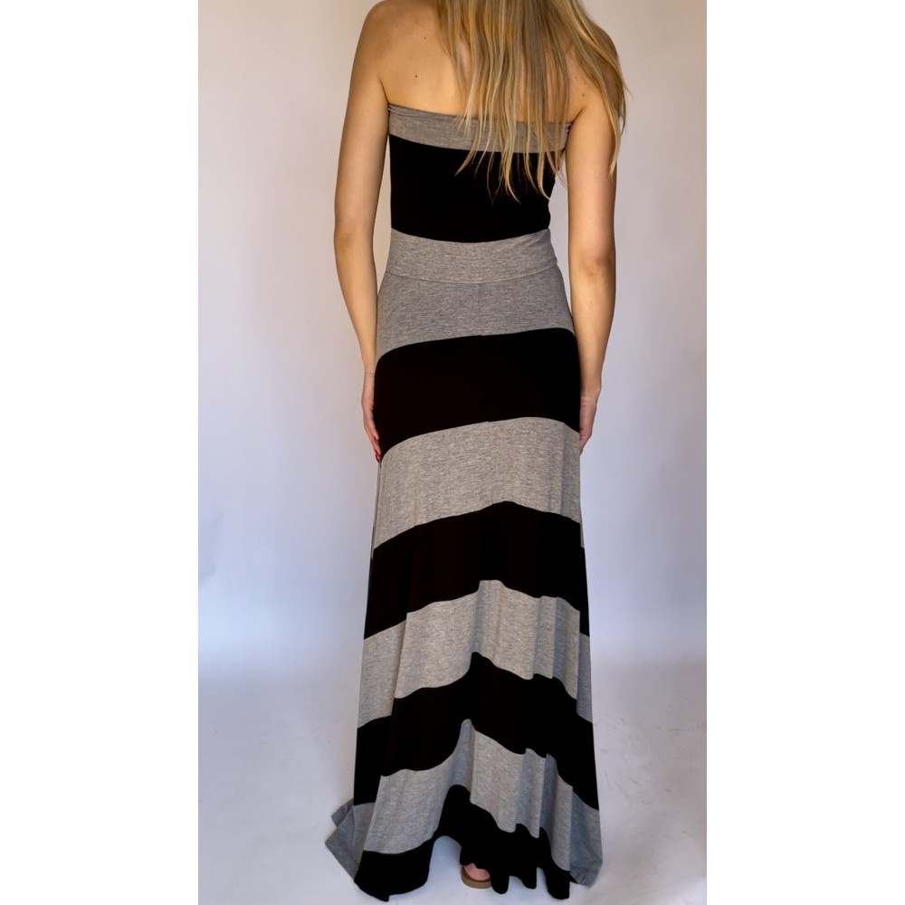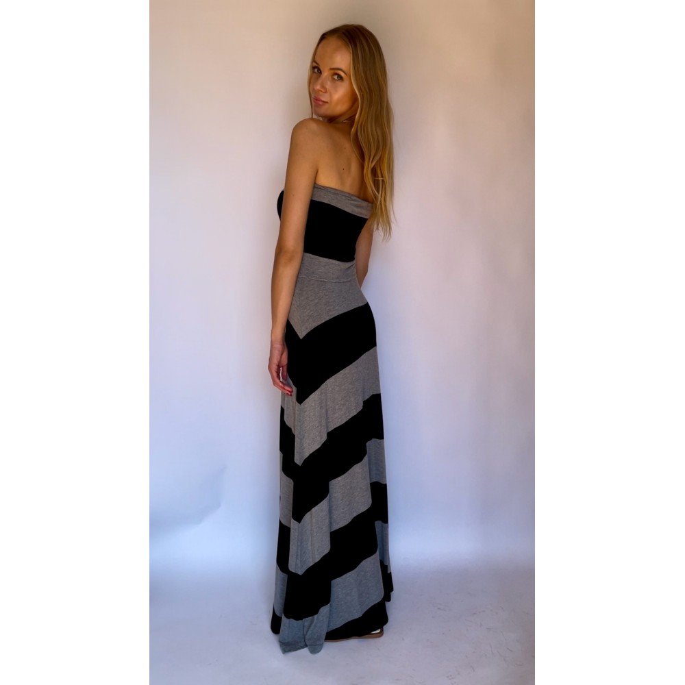 Długa maxi czarno szara sukienka bez ramiączek, bez rękawów, w szerokie paski, gumka w talii.