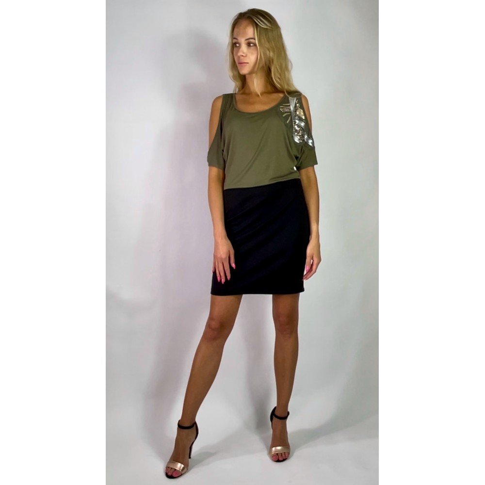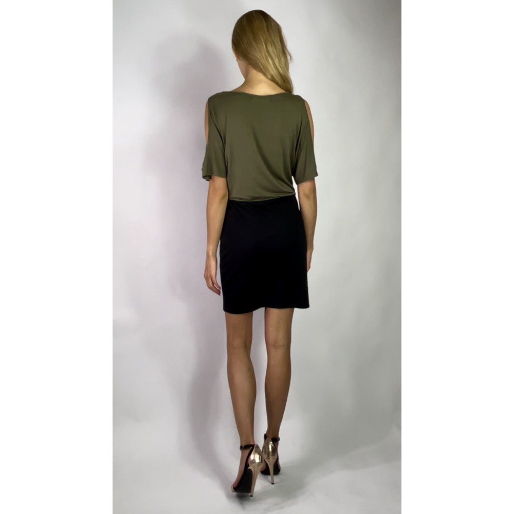 Dwukolorowa sukienka z ozdobnym elementem przy ramieniu, gumką w pasie, rozcięciami na rękach ramionach oraz z luźniejszą górą i przylegającym dołem.