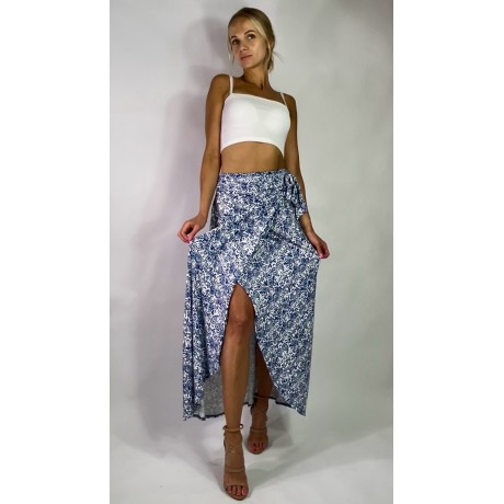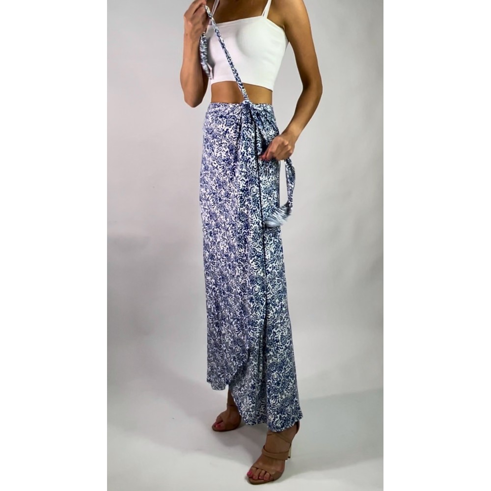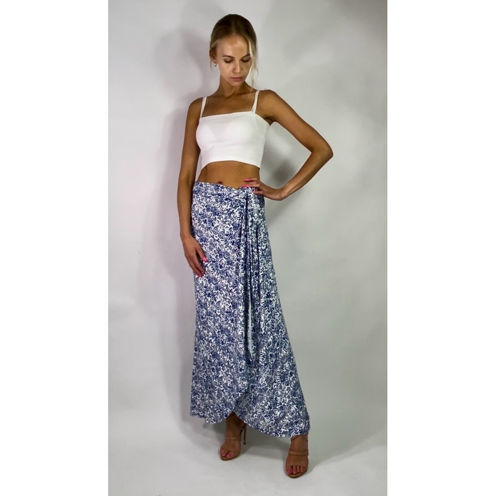 Niebiesko biała długa spódnica z wiskozy z rozcięciem na boku, wiązana na zakładkę, marki CYNTHIA ROWLEY.