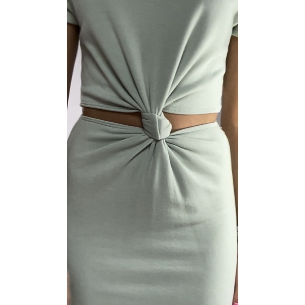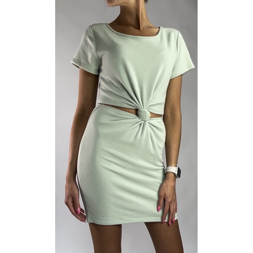Miętowa krótka sukienka z wiązaniem na przodzie, wycięta w talii, z krótkim rękawem i okrągłym dekoltem.