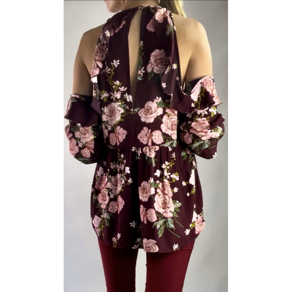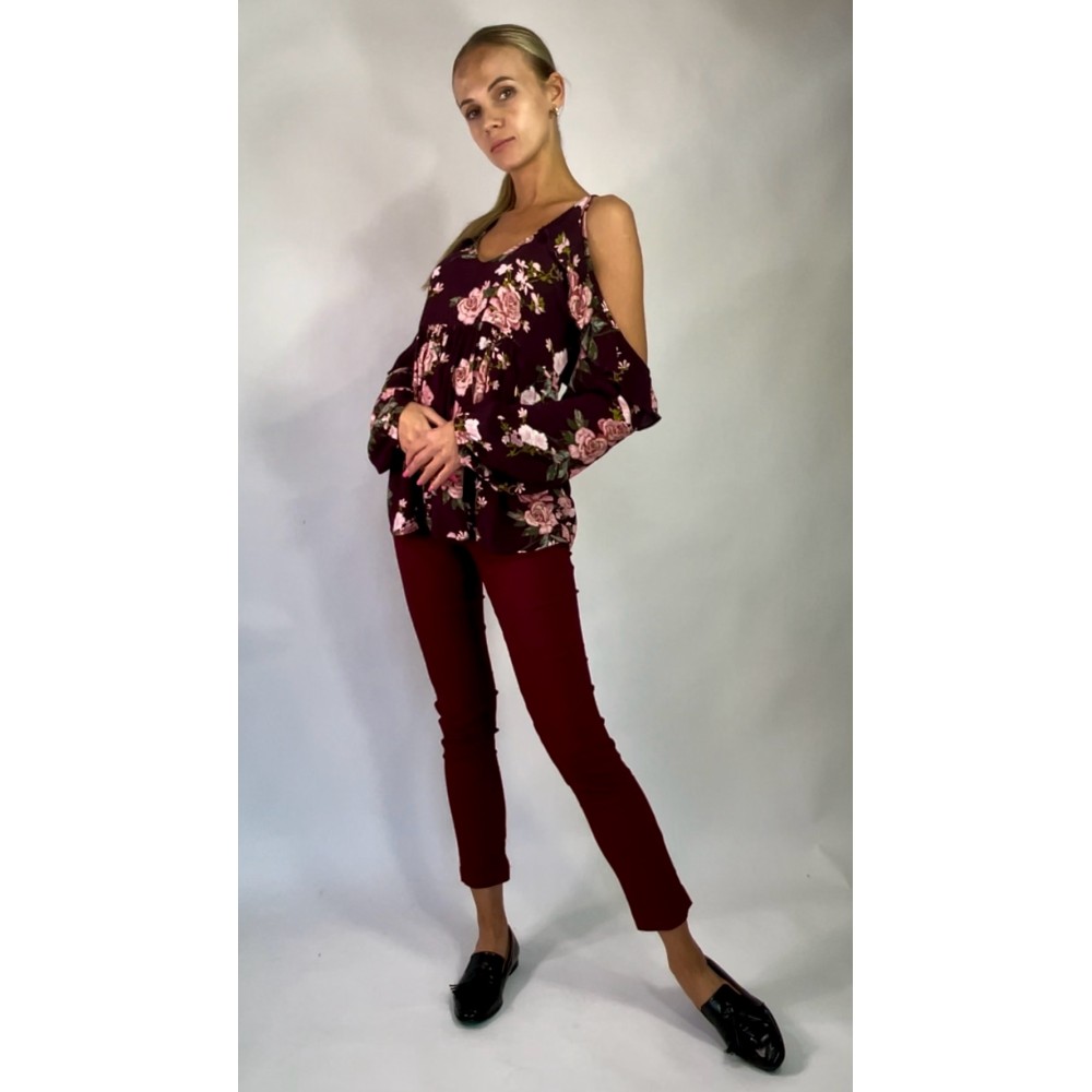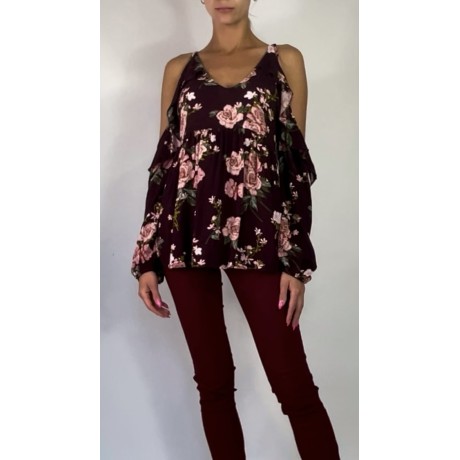 Bordowa bluzka z metką marki American Eagle, z wiskozy, z odkrytymi ramionami, długim rękawem, printem w kwiaty.