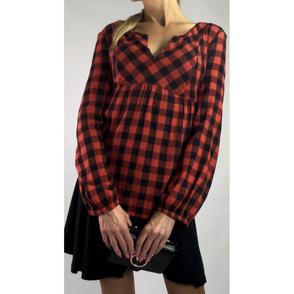 Bluzka w czerwono-czarną kratę z długim rękawem, odcinana pod biustem, lekko rozszerzana, rękawy zakończone ściągaczem.