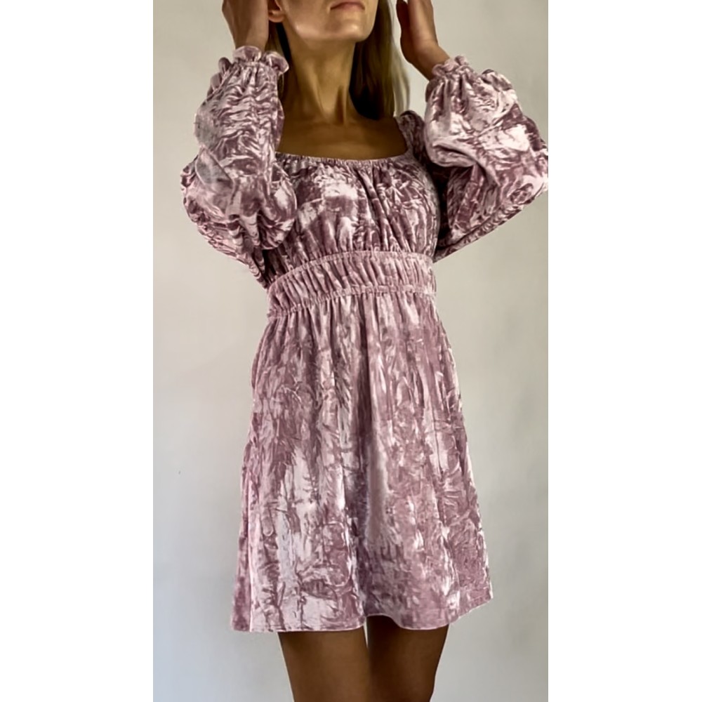 Krótka różowa sukienka "welurowa" z połyskiem z gumką w talii, przy rękawach i przy dekolcie, z długim rękawem.