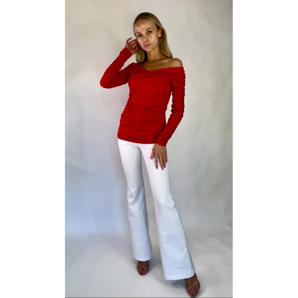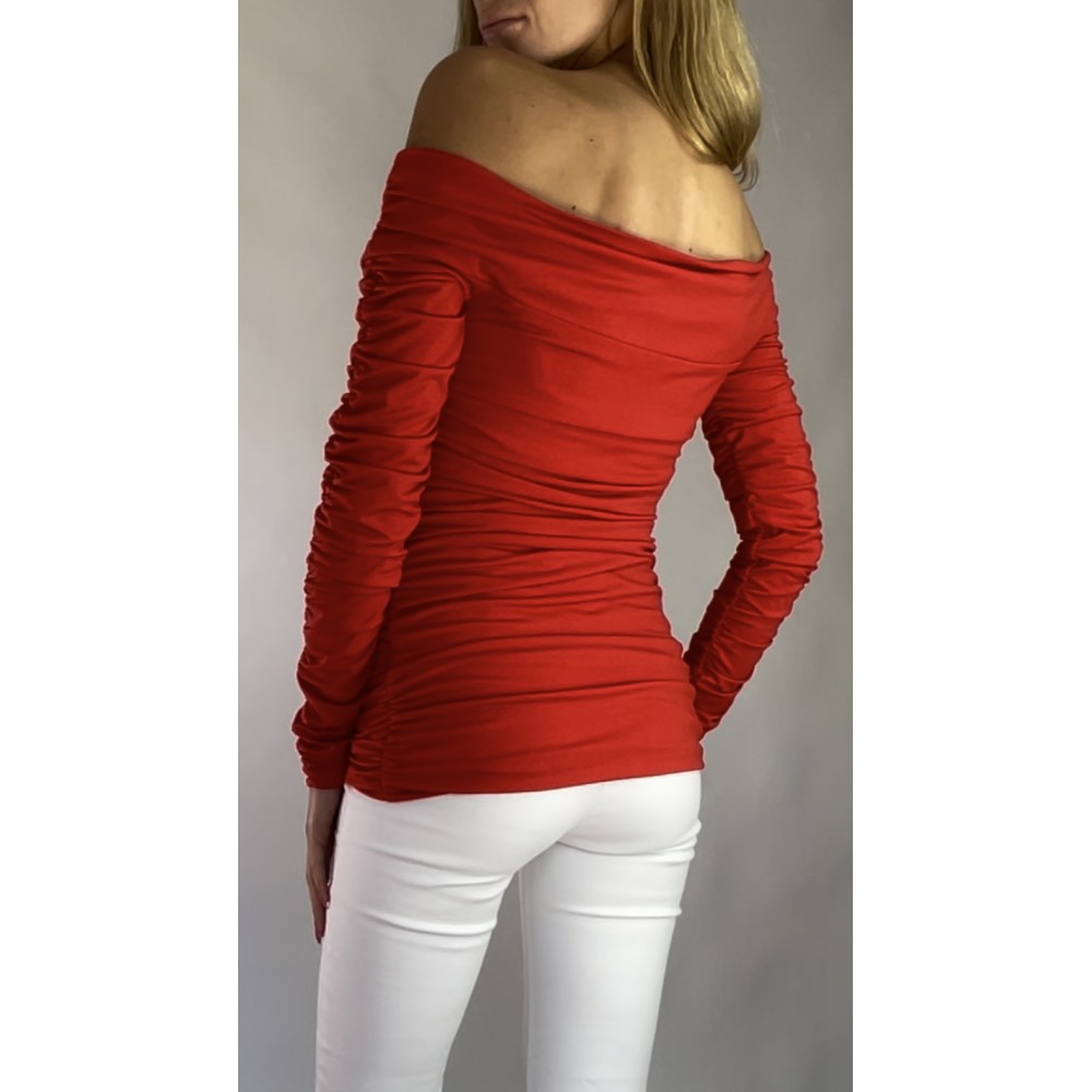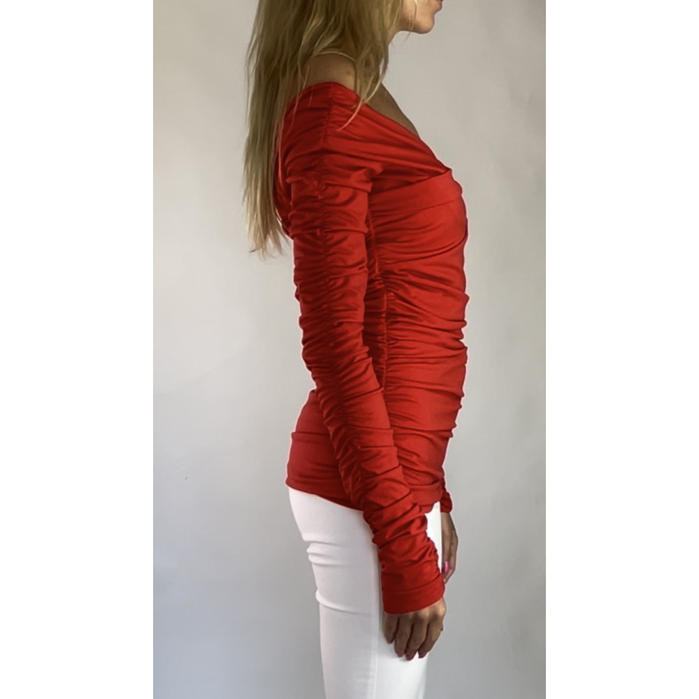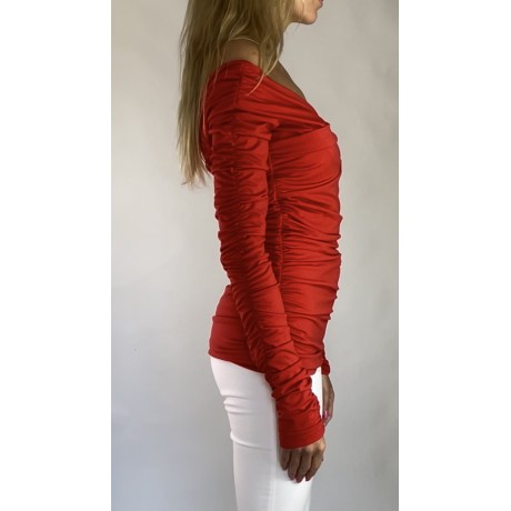 Czerwona drapowana bluzka z długim rękawem, odsłoniętymi ramionami i marszczeniami.