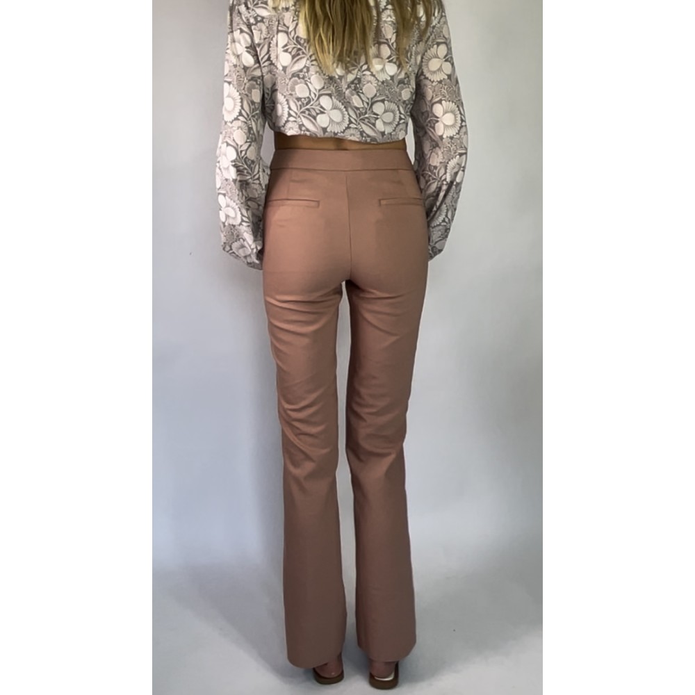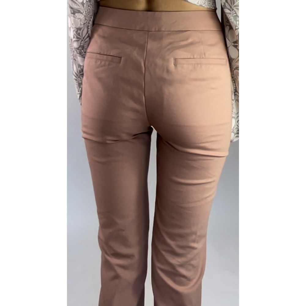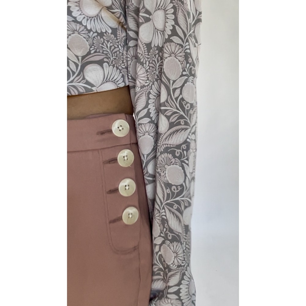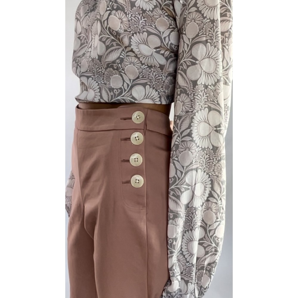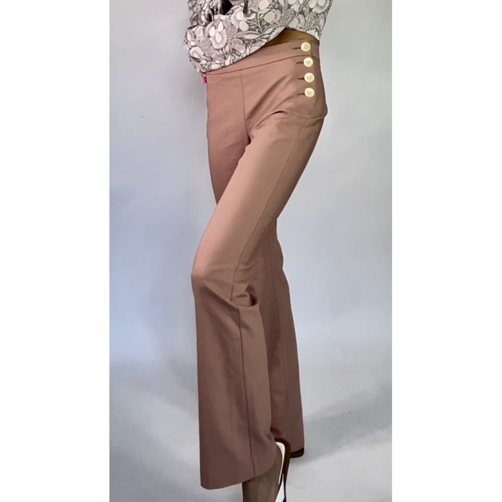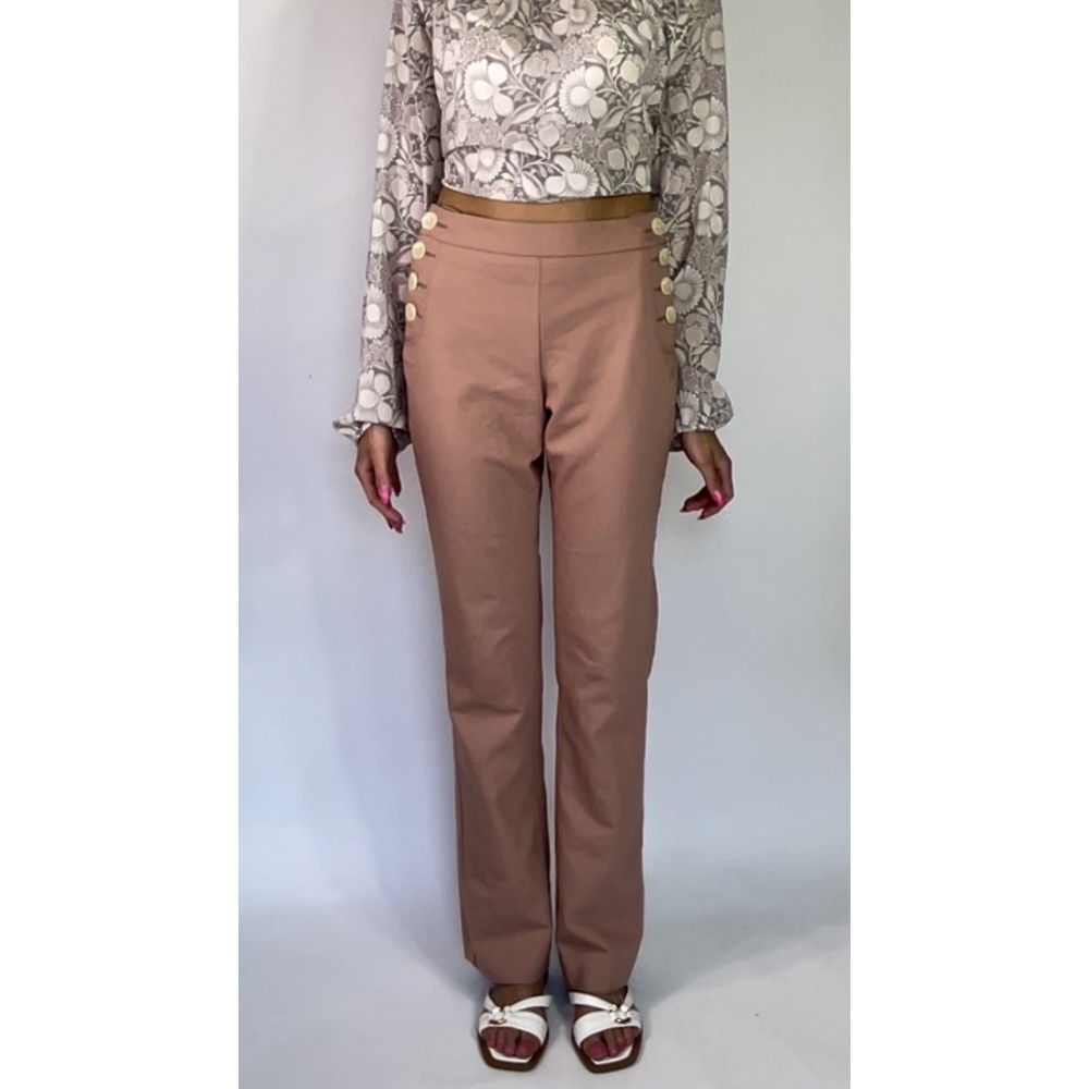 Długie spodnie z elastycznego materiału w kolorze przygaszonego różu/łososiowym, z prostą nogawką, średniej wysokości stanem, zapinane na boczne guziki.