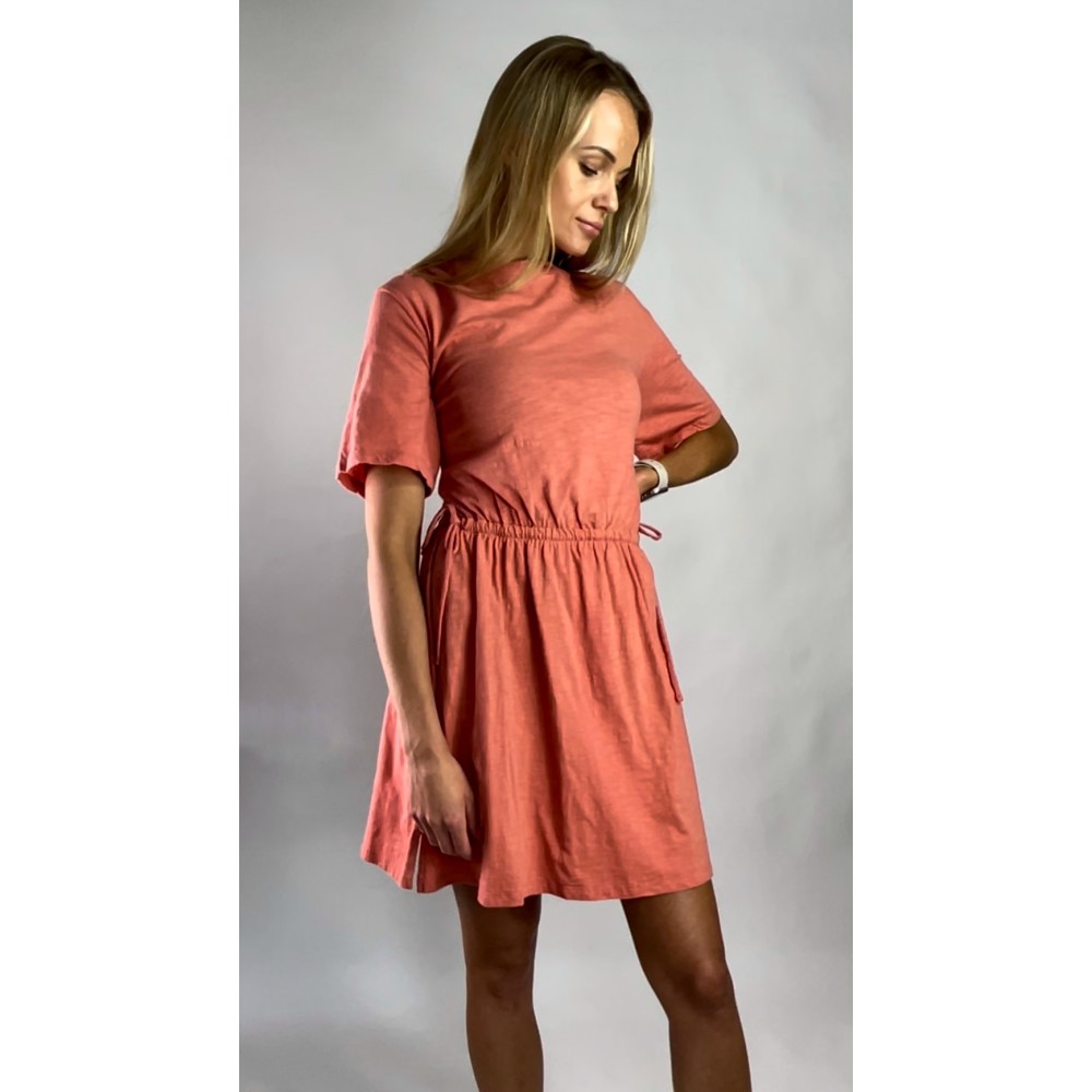 Krótka łososiowa sukienka z bawełny z wszytym sznurkiem w pasie, z krótkim rękawem, okrągłym dekoltem i zwiewnym dołem.
