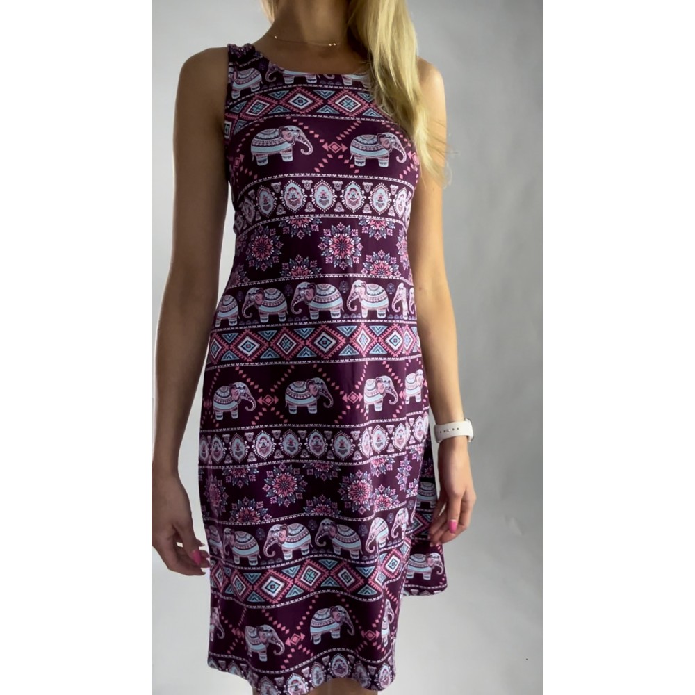Fioletowa sukienka o rozszerzanym kroju z rustykalnym printem w słonie.