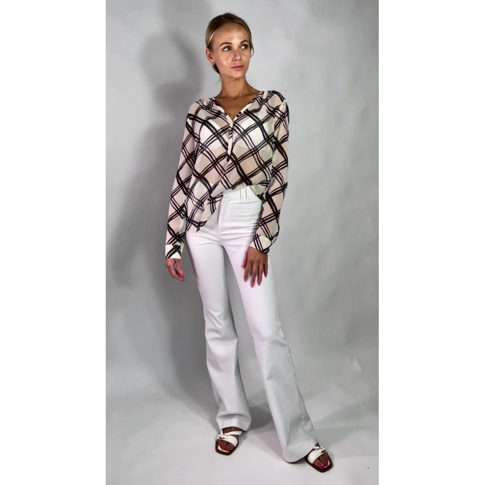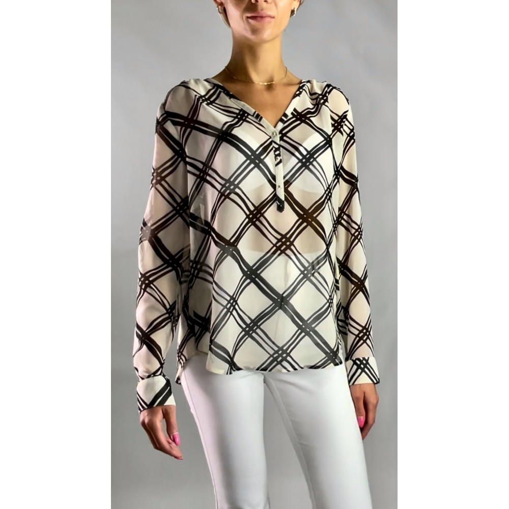 Beżowa bluzka marki Banana Republic w ozdobną kontrastową kratę, z długim rękawem i rozpinanymi złotymi guzikami na przodzie.