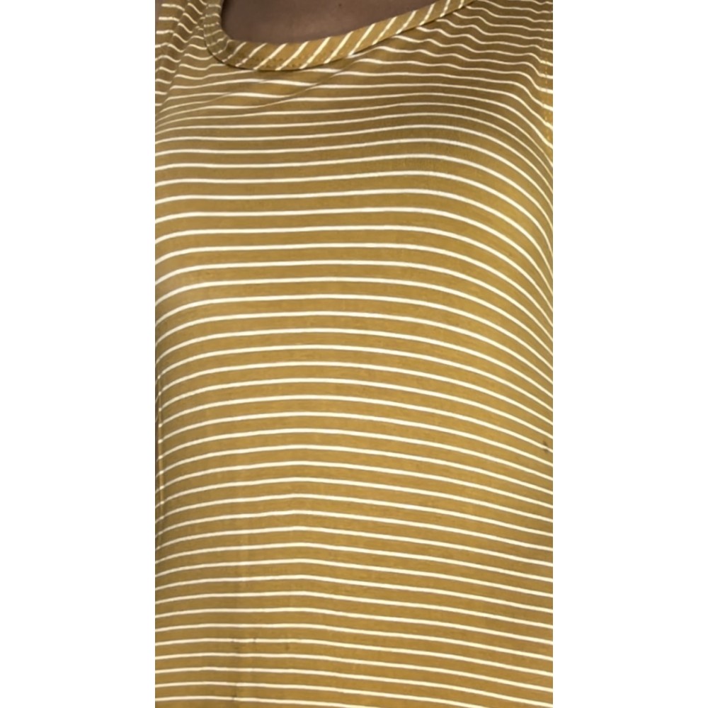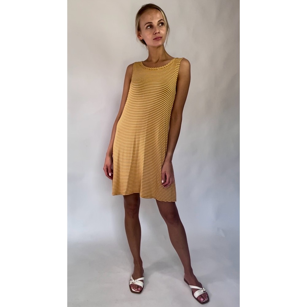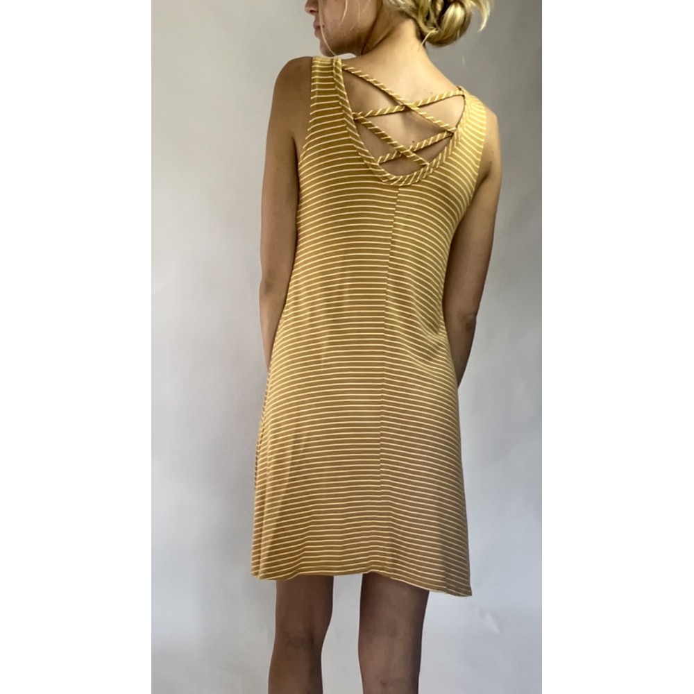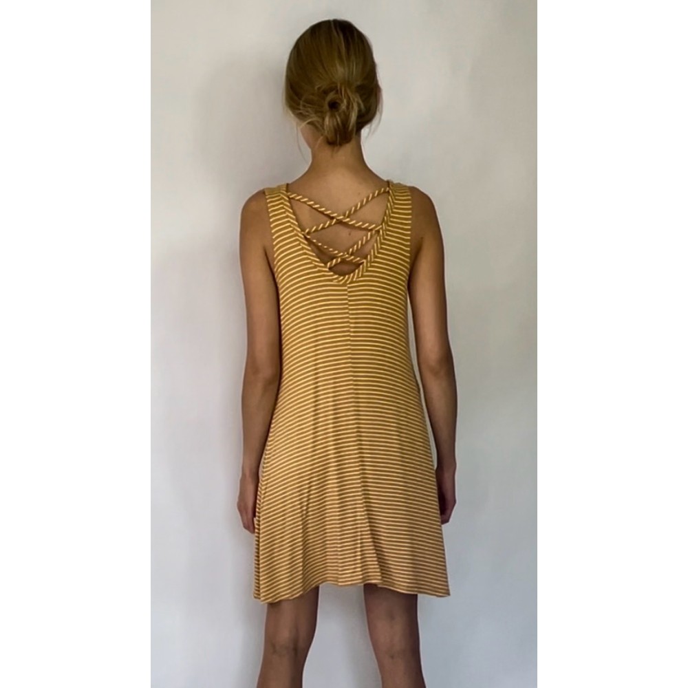Zwiewna, żółta sukienka z wiskozy marki Olivia Rae, w białe paski, z ozdobnym dekoltem na plecach.