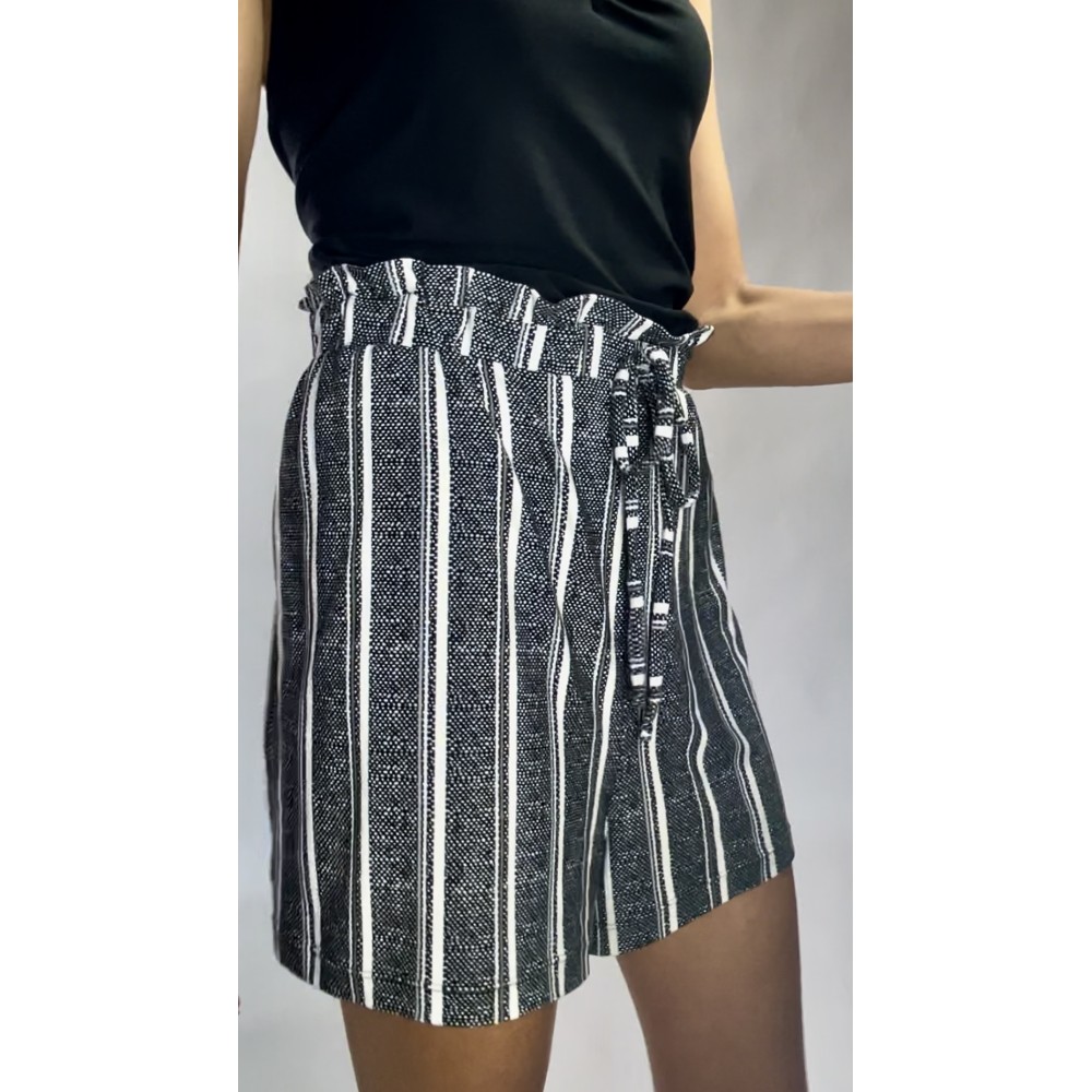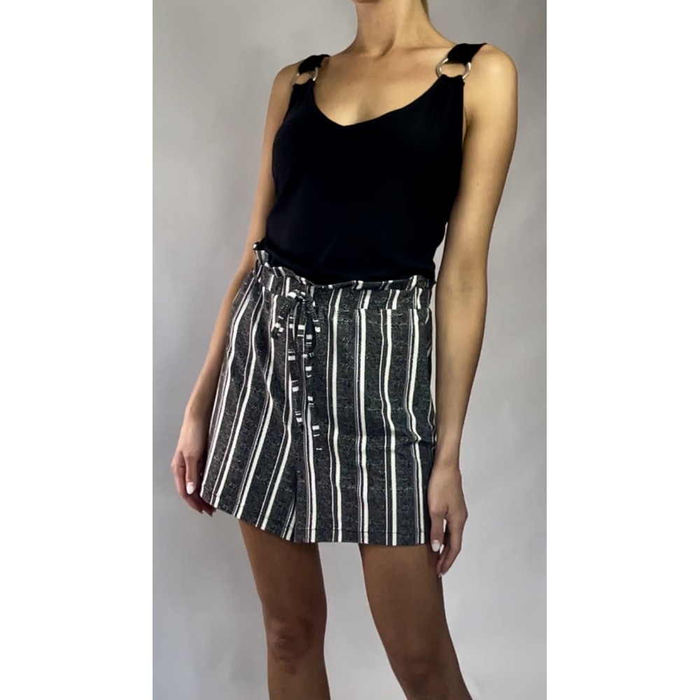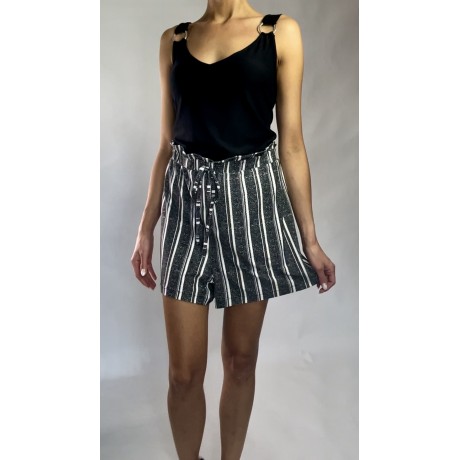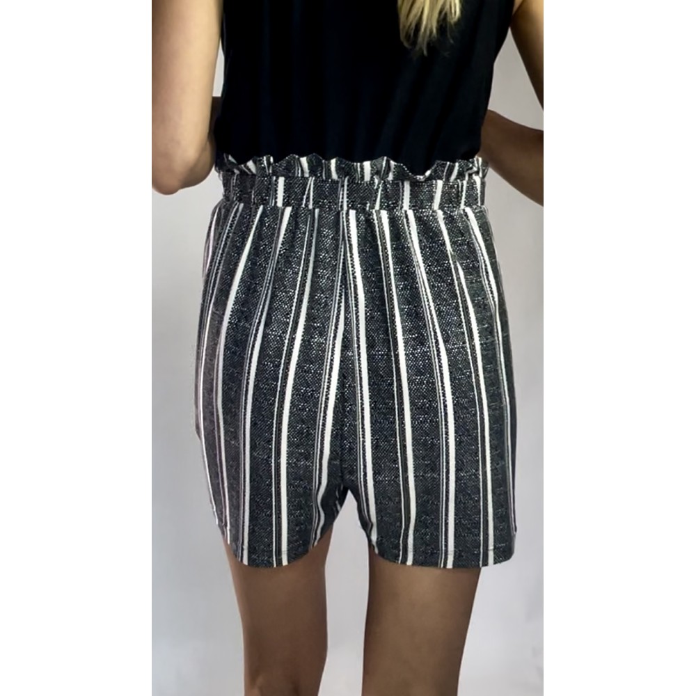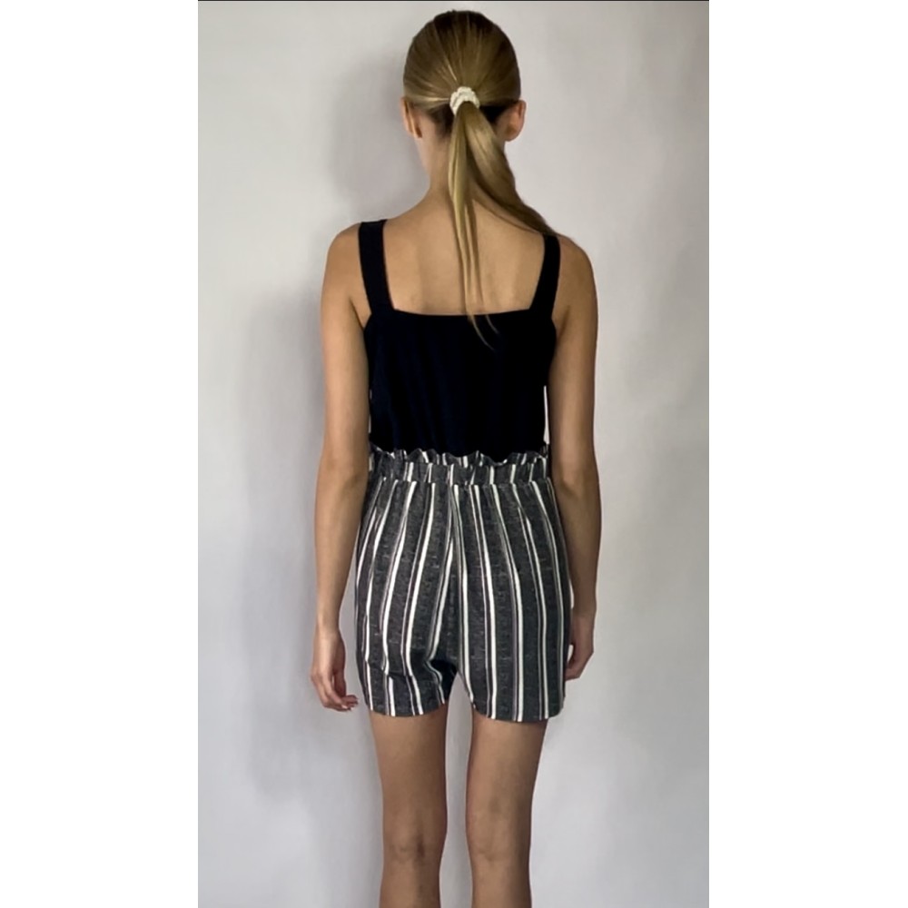 Kombinezon z krótkimi spodenkami w paski, z czarną górą na ramiączkach i gumką w pasie.