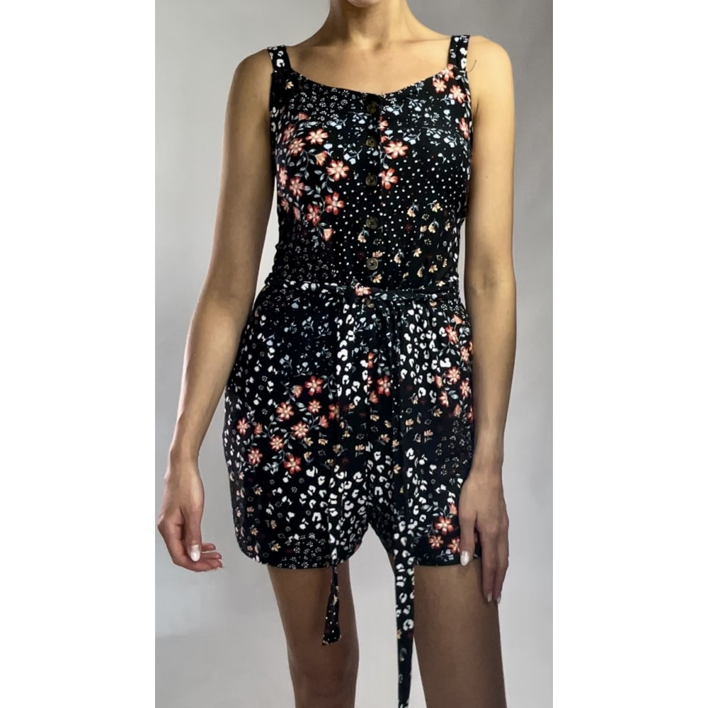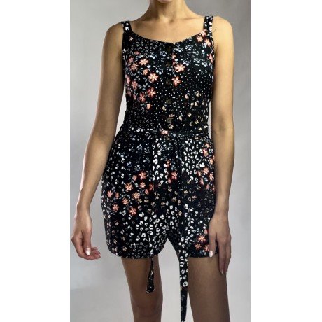 Krótki czarny kombinezon z kieszeniami, rozpinanymi guzikami na przodzie, gumką i wiązaniem w pasie.
