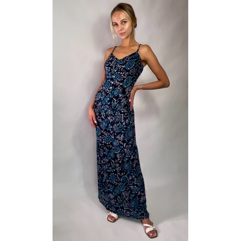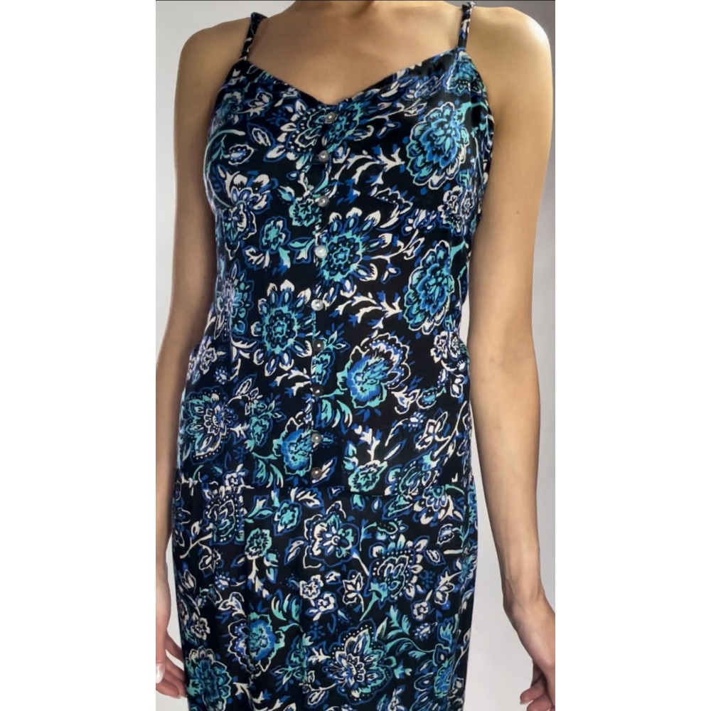 Nowa, długa letnia sukienka z wiskoza w kolorze czarnym z niebieskim printem, zapinana na guziki z przodu, z regulowanymi ramiączkami.