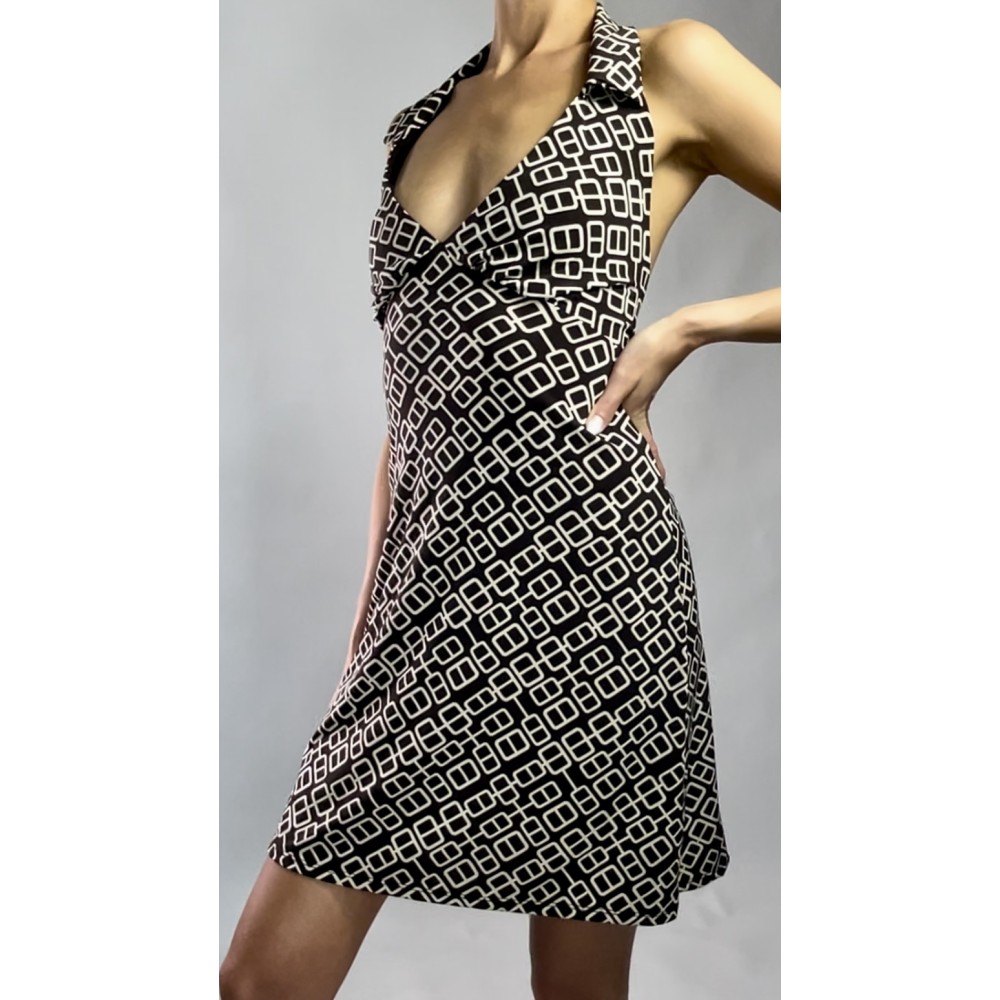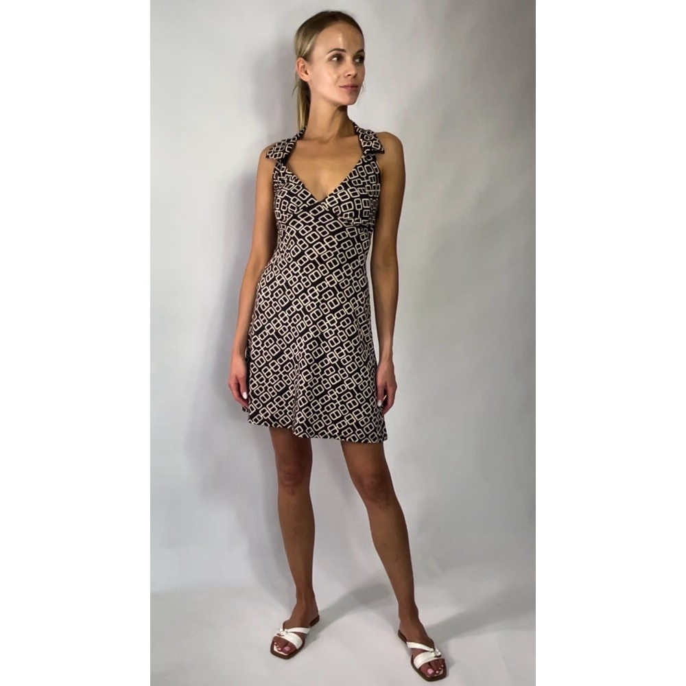 Nowa krótka sukienka w kolorach beżu i brązu, z gumką w talii, bez rękawów, z kołnierzykiem i dekoltem.
