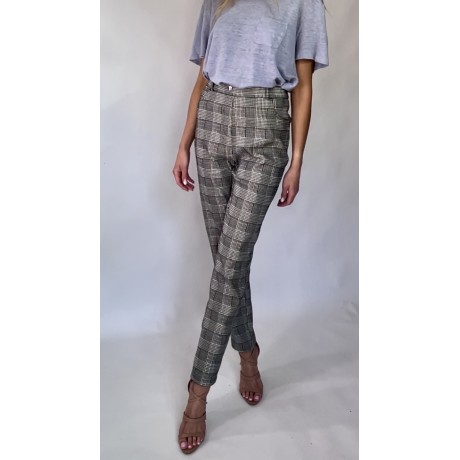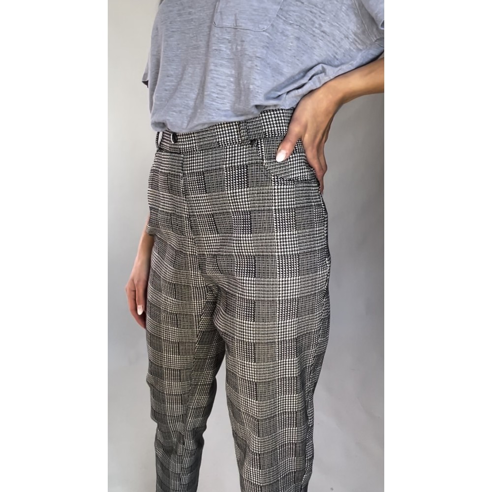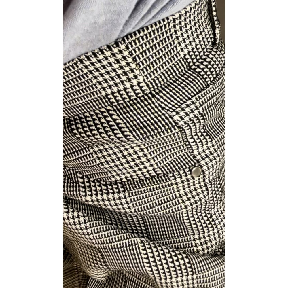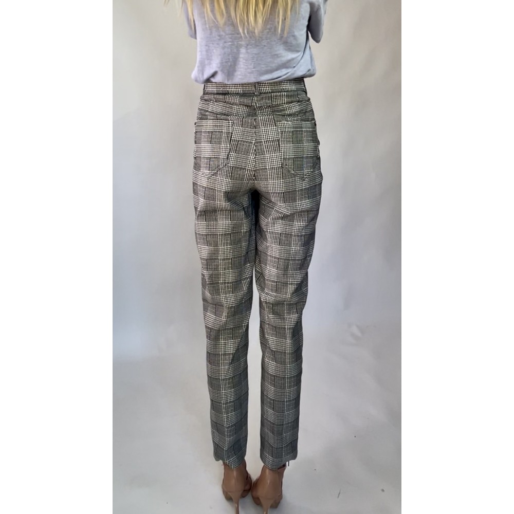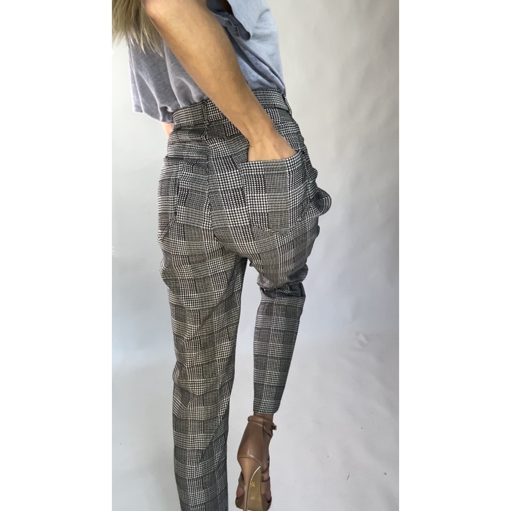 Czarno-białe, dopasowane, elastyczne spodnie z dodatkiem wiskozy przeszyte złotą nitką, z lekko zwężanymi nogawkami, kieszeniami z tyłu oraz z gumką w pasie.