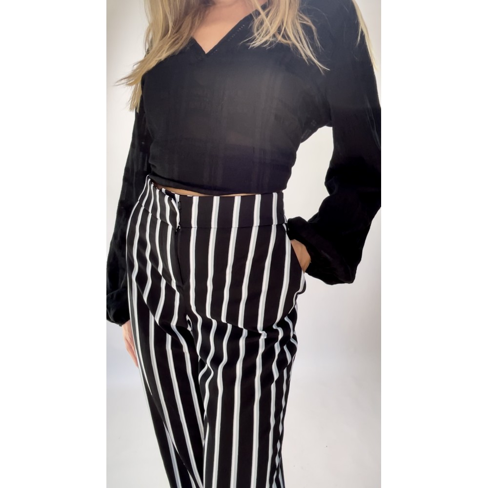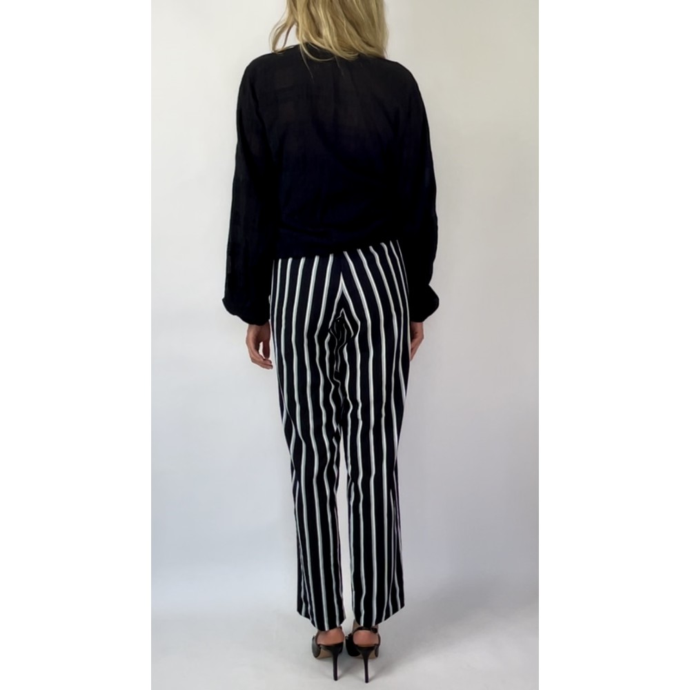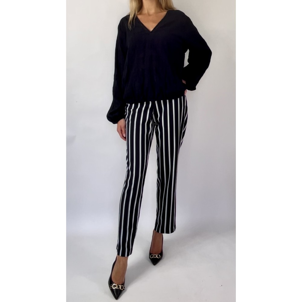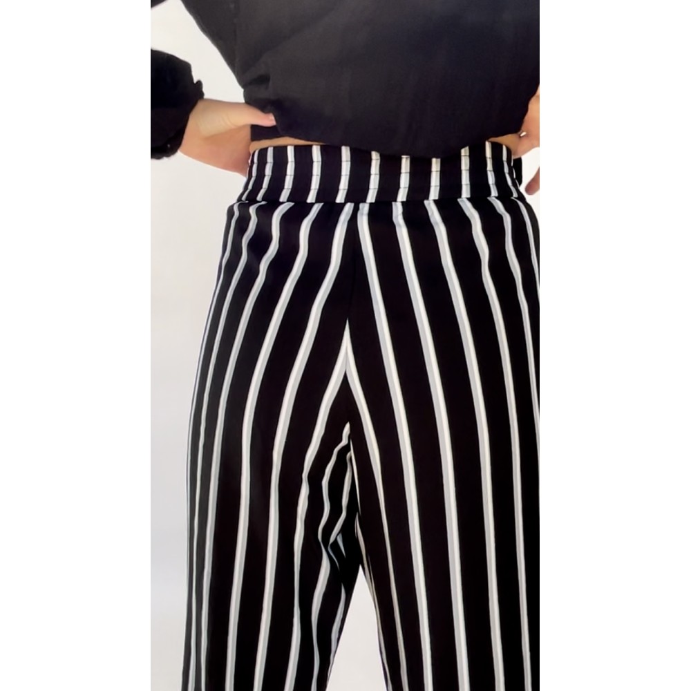 Czarne spodnie w białe paski, zapinane na haftkę i suwak, z kieszeniami i gumką w pasie.