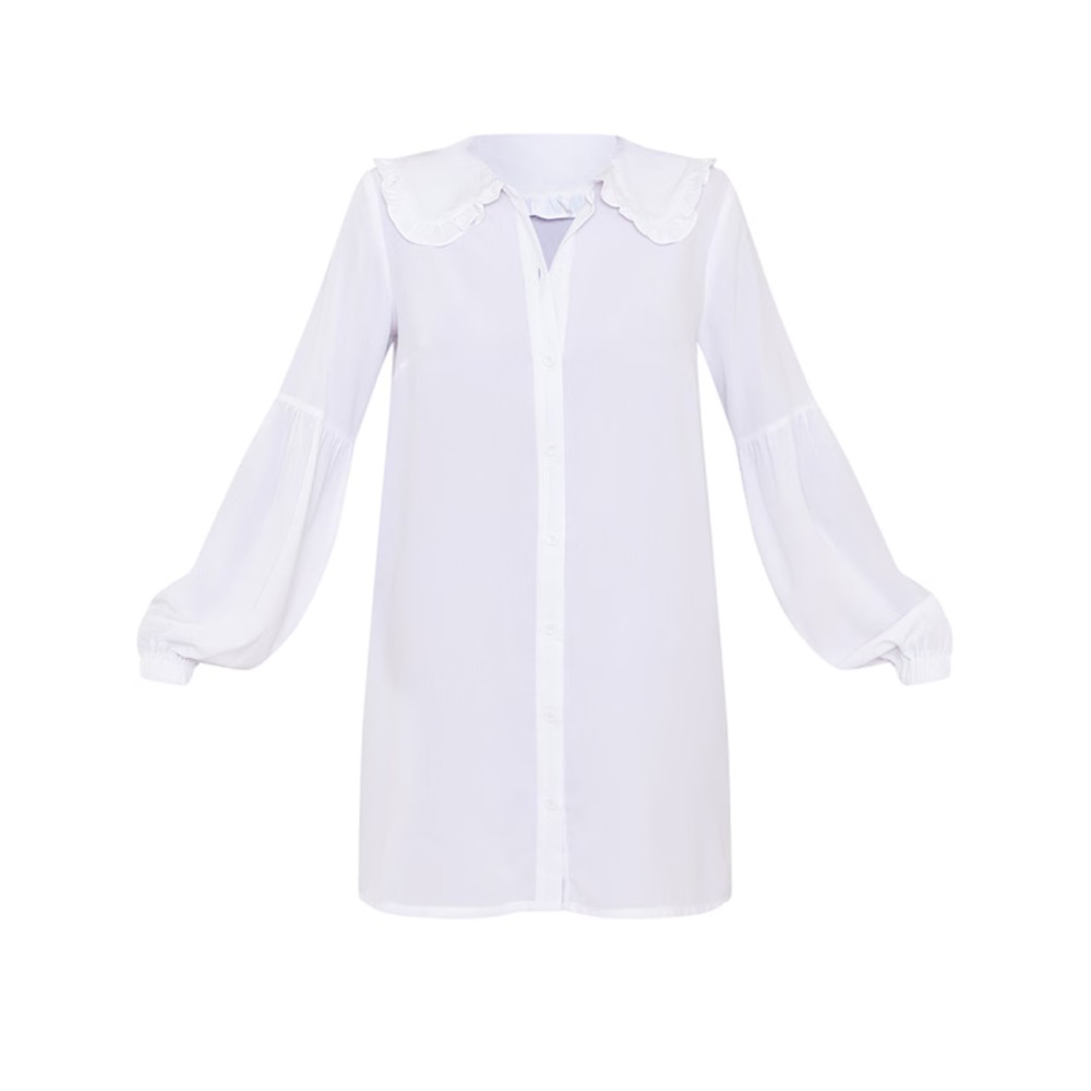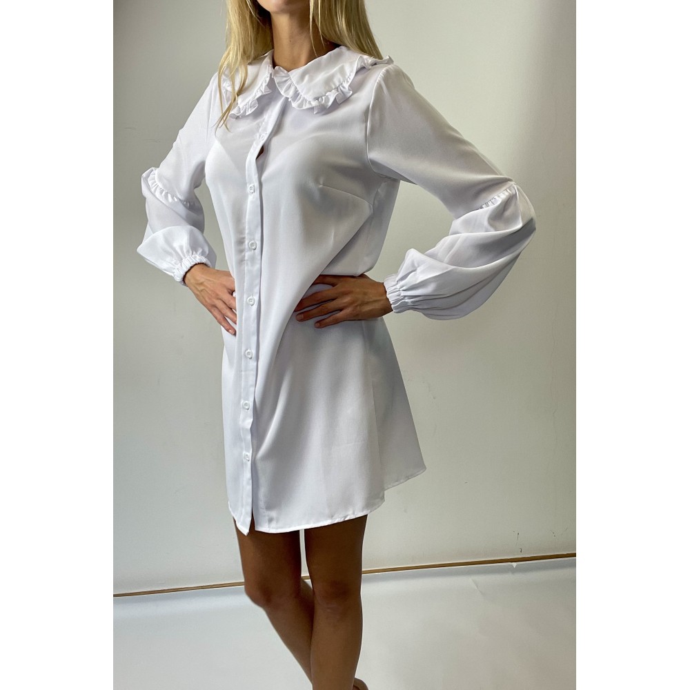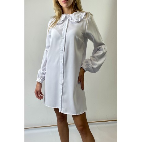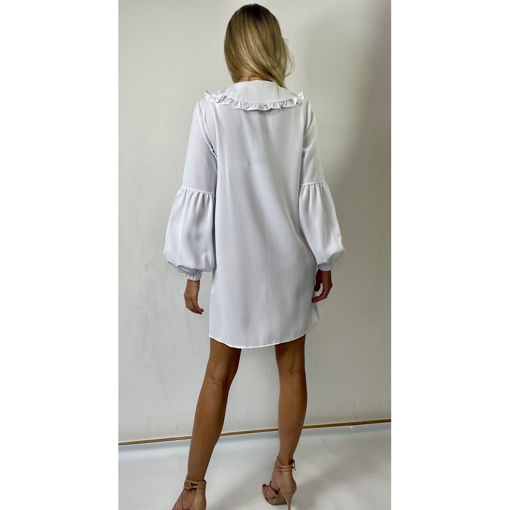 Nowa biała sukienka w stylu koszulowym z dużym, ozdobnym kołnierzem, zapinana na guziki, długi rękaw.