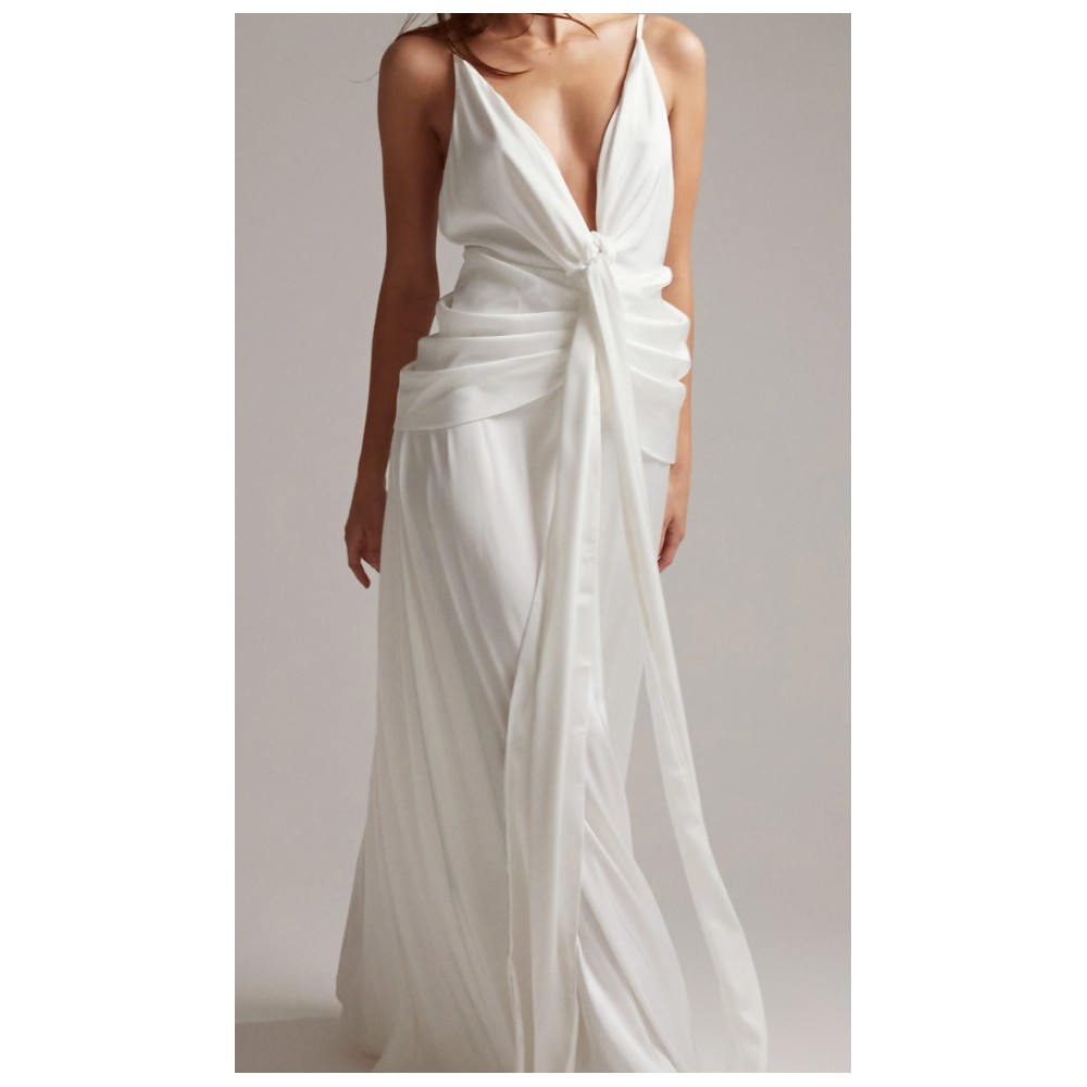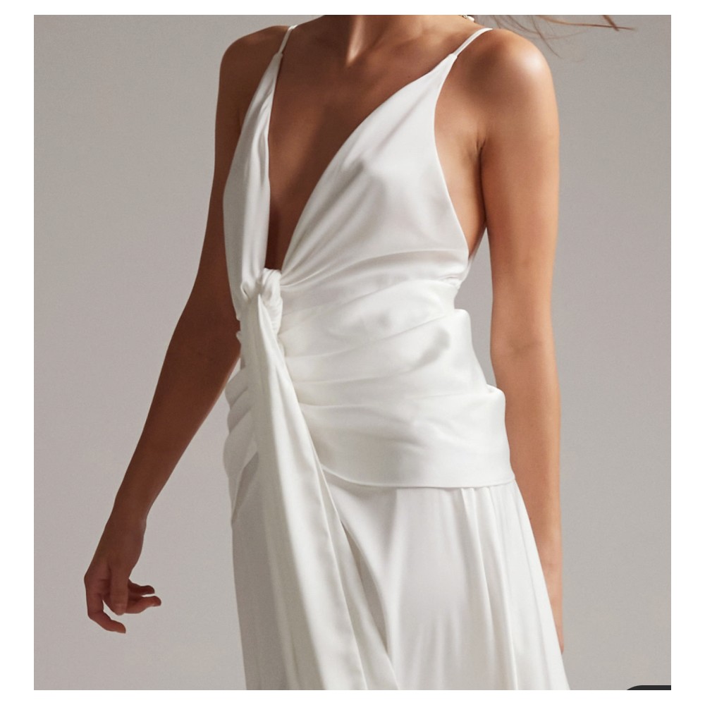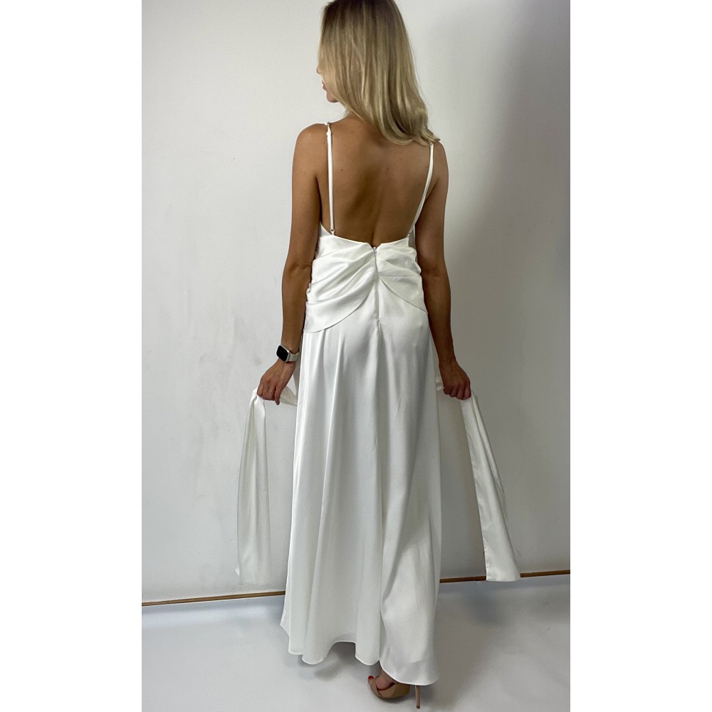 Nowa, drapowana satynowa suknia ślubna Emily z głębokim dekoltem, w kolorze kości słoniowej.