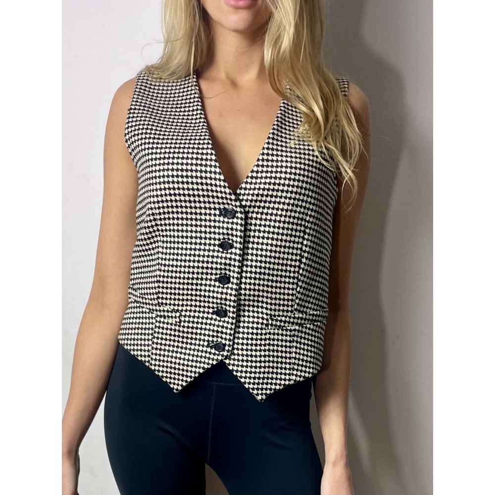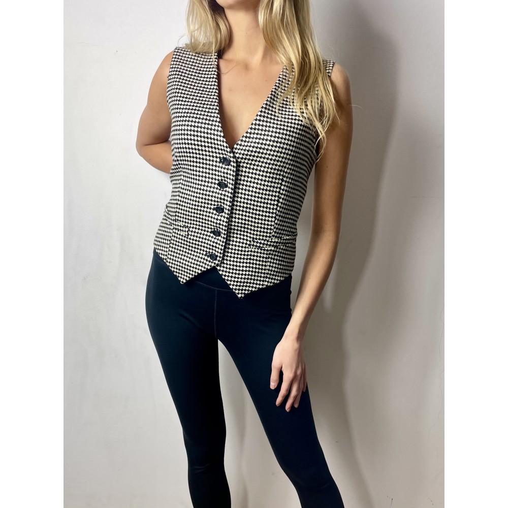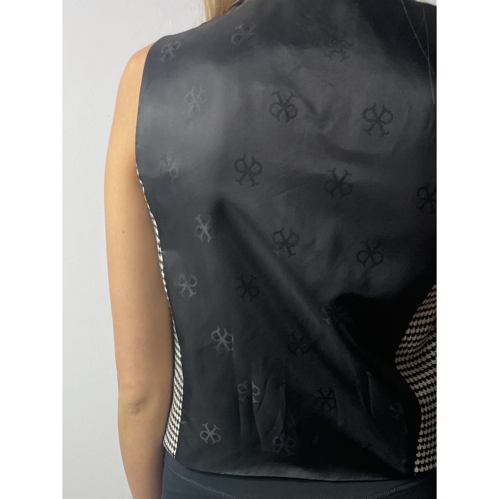 Czarno-biała kamizelka Pinko z wełną zapinana na guziki, logowana na plecach.