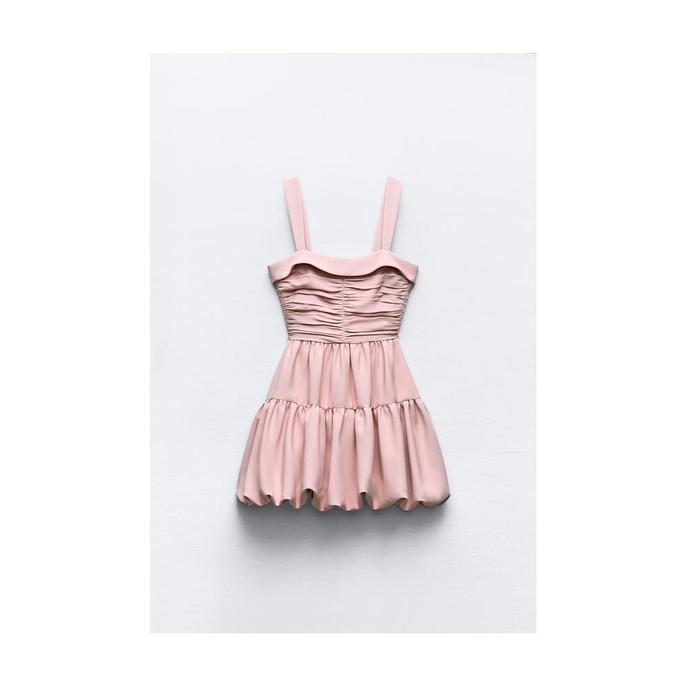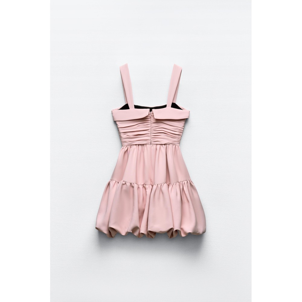 Nowa sukienka balonowa z drapowaniem w kolorze pudrowego różu, zapinana na suwak z boku, z podszewką i falbanami.