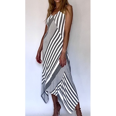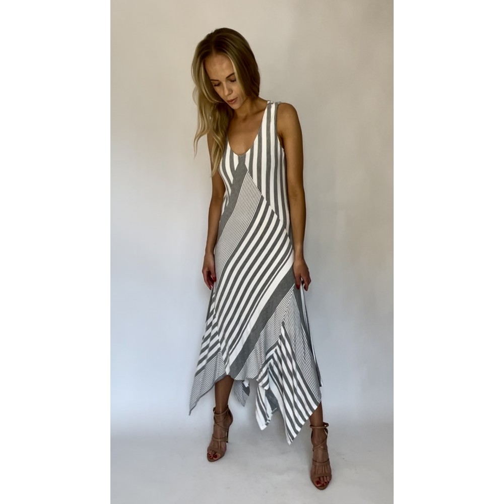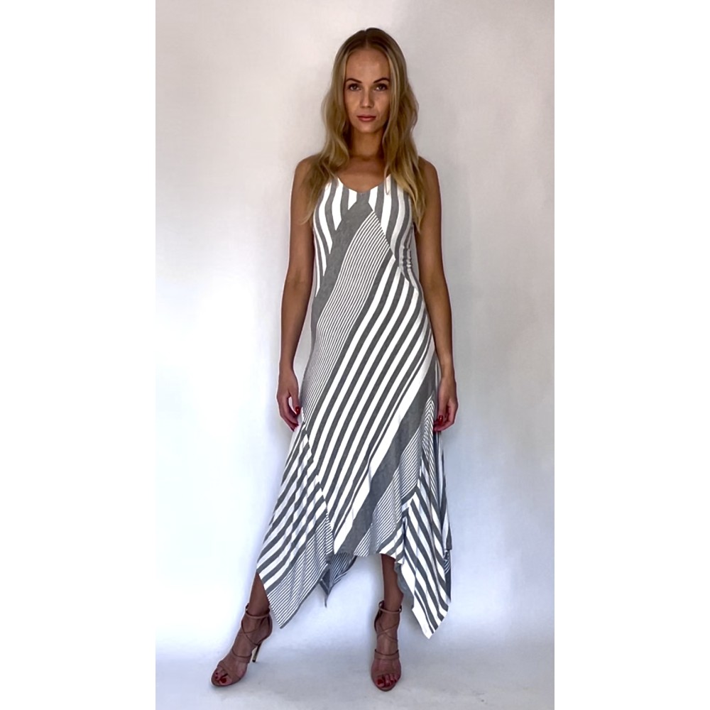 Asymetryczna biało-szara długa sukienka w paski, z modalu, z podszewką.