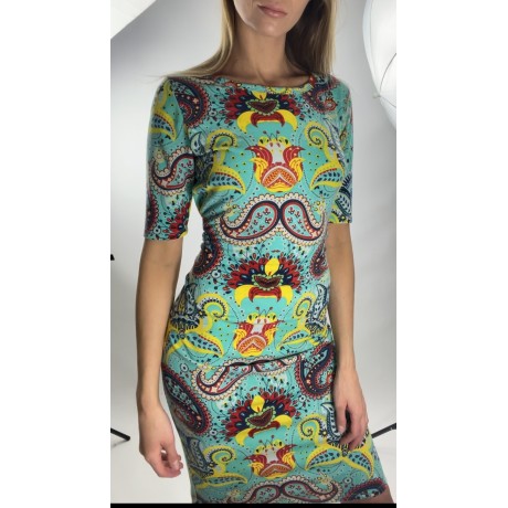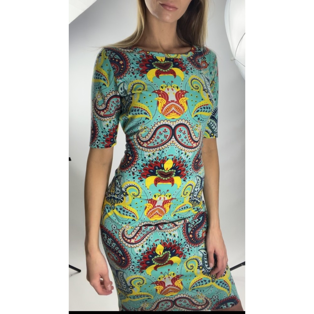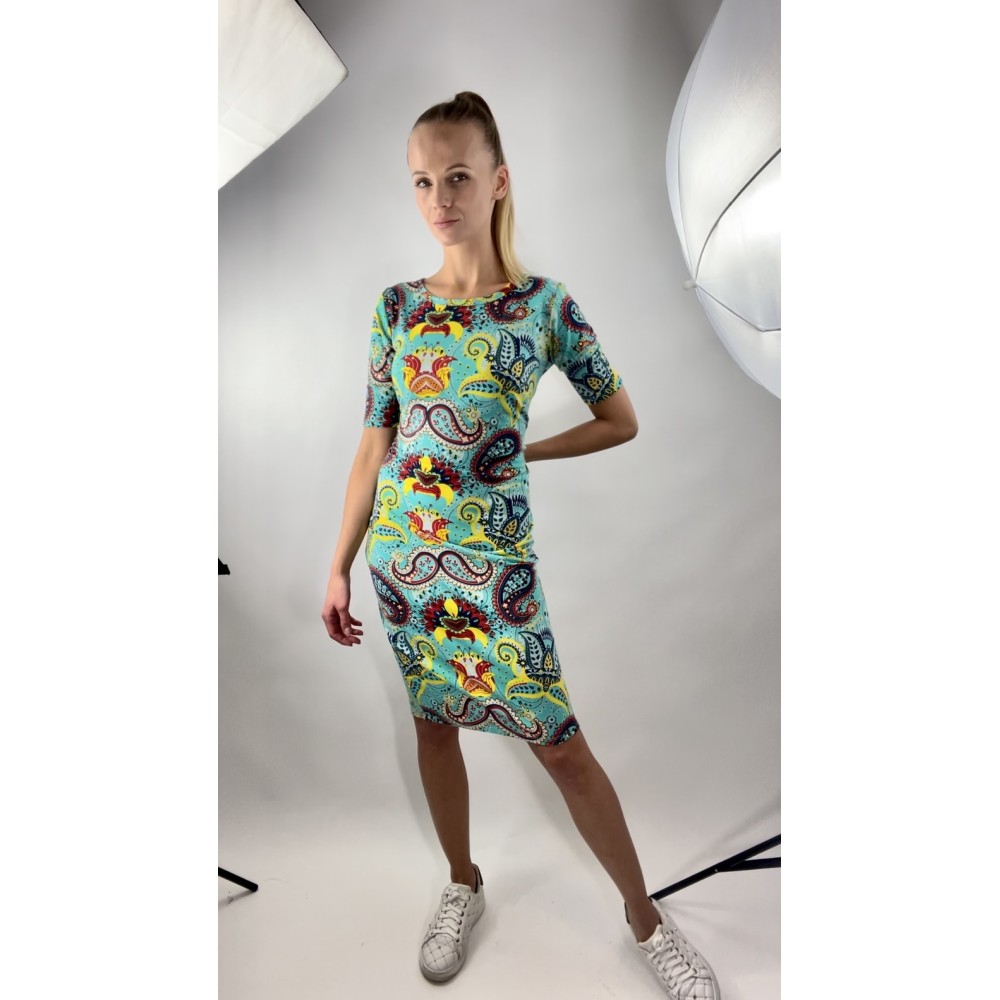 Kolorowa, dopasowana sukienka w orientalne wzory, krótki rękaw.